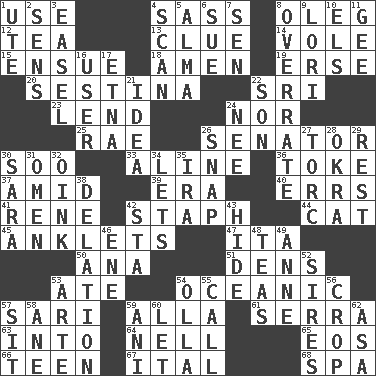 ACROSS 1. Purpose 4. Backtalk 8. Cassini of fashion 12. Beverage made from leaves 13. A slight indication 14. Short-tailed, large-bodied rat 15. Take place subsequently 18. So be it 19. Celtic language 20. French poetic form 22. Indian title of respect (Mr.) 23. Grant temporary use of 24. Not either 25. Actress Charlotte 26. Elected representative 30. "Barney Miller" actor Jack 33. Place in a line 36. Puff or smoke 37. Among 39. Epoch 40. Blunders 41. French philosopher Descartes 42. Staphylococcus 44. Feline 45. Short socks 47. Call ___ day 50. Santa ___, CA 51. Habitations of wild animals 53. Had dinner 54. Pertaining to the sea 57. Indian skirt 59. Silent film actress Nazimova 61. Father Junipero _ 63. To the inside or interior of 64. 1994 drama film starring Jodie Foster 65. Greek goddess of the dawn 66. Adolescent 67. Slanted text style (abbr.) 68. Health resort DOWN 1. Shoshoni 2. Elected reps. 3. Artist's stand 4. Skim 5. _ mater 6. Institute legal proceedings 7. Elected rep. 8. Make much ado about nothing 9. Australian parrot (variant) 10. Raised railways 11. Turn to the right 16. One who makes use of a thing 17. Inactive volcano in Sicily 21. It may be bright or harebrained 22. Manchild 24. Born 26. Fastener 27. Torque (variant) 28. Gumbo ingredient 29. Take ten 30. "Two Mules for Sister ____" 31. Presage 32. Pig sound 34. Allows 35. Retirement account (abbr.) 38. Conveyance 42. R.R. building 43. Flintstone garb 46. Compass dir. 48. Beverages made from leaves 49. Queen of England 1702-14 52. Male parents of animals 53. Johnson of "Laugh-In" 54. Rounded earthenware pot or jar 55. Give a ring to 56. Riding implement 57. Be seated 58. One (Scot) 59. Cuckoo 60. Allow 62. White ___ sheet