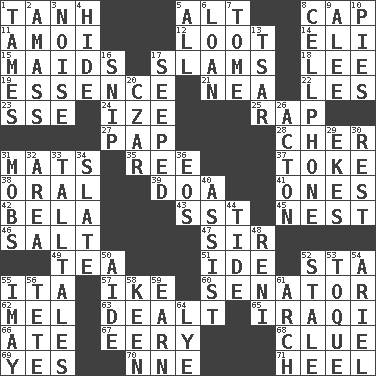 ACROSS 1. Hyperbolic tangent 5. Keyboard modifier key 8. Head covering 11. Mine, in Marseilles 12. Plunder 14. Biblical high priest 15. Women servants 17. Shuts with force 18. Area sheltered from the wind 19. Core 21. Teachers' org. 22. French article 23. Compass dir. 24. Ending with capital 25. Reproach for some lapse or misdeed 27. Infant food 28. "Mermaids" star 31. Floor protectors 35. Portuguese money of account (variant) 37. Casino tip 38. Spoken 39. ___ good deed 41. Singles 42. Actor Lugosi 43. Fast jet (abbr.) 45. A home for chicks 46. Table seasoning 47. Title for a knight 49. Afternoon social gathering 51. Binary compound 52. R.R. building 55. Call ___ day 57. Eisenhower's nickname 60. Legislator 62. Cartoonist voice _ Blanc 63. Started a card game 65. Resident of Iraq 66. Had dinner 67. Suggestive of the supernatural 68. A slight indication 69. Consenting reply 70. Compass dir. 71. The bottom of a shoe or boot DOWN 1. Domesticates 2. Collect or gather 3. Annoying sound 4. Flintstone garb 5. Everything 6. Grant temporary use of 7. Heavy book 8. Portable communications device 9. Toward shelter 10. Sliced desserts 13. Russian ruler of old 16. Clip 17. Oozed 20. Russian ruler of old 26. NE Massachussets city 29. Supplements with great effort 30. Respite 31. Crowds into 32. Type of rug 33. Baron Munchausen's specialties 34. Chalkboard 36. Greek goddess of the dawn 40. Help 44. Periodic rise and fall of the sea level 48. Painter Guido (1575-1642) 50. Assistant 52. Having lost freshness 53. Woman's close-fitting hat 54. Satellite of Uranus 55. "If ____ say so..." 56. False hair 58. Peachy ____! 59. Merit 61. Bowlike part 64. Sodium hydroxide