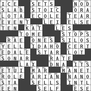 ACROSS 1. Frozen water 4. Puts into a specified state 8. Dreamland 11. Thick slice 13. Unemotional 15. Mouth or opening 16. Globular water bottle used in Asia 17. Learning spot: Fr. 18. Rend 19. Happening 21. Flowery wreath 22. Otherwise 23. "___ Little Indians" 24. Krazy ___ of comics 27. French article 29. Heavy book 30. Obstructs or blocks passage 34. Actress Charlotte 36. Singles 39. Grain storage towers 40. Shout 41. Potato state 43. Sure thing 44. Peak District village in England 46. Play the lead 47. Car dealer's back yard 48. Echolocation 49. Assign a rank or rating to 51. Not strict 53. Heredity factor (abbr.) 54. ___ a Wonderful Life 57. Needle case 60. Impair 63. French painter Edouard 65. Hero or heavy, e.g. 66. Believer in; advocate of (suffix) 69. Billionth: prefix 70. R.R. building 71. Exchanges for money 72. International (abbr.) 73. Car or cant ending 74. Automatic 75. Compass dir. DOWN 1. Small island 2. Garlic unit 3. Ingested 4. Compass dir. 5. And so on (abbr.) 6. Implement 7. Drop; flow; fall 8. Christmas carol 9. Mouths or openings 10. Have the gumption 12. Bar 14. To provide with a ceiling 18. A testis 20. Ring climax 25. Mine, in Marseilles 26. Looks after 28. Curvy letter 29. Copy Pinocchio 31. Butter sub 32. Sweet dark-red dessert wine 33. Fast jet (abbr.) 34. Do over again 35. Actor Alda or Thicke 37. Consume 38. Pottery fragment 40. Affirmative reply 42. NW Algerian seaport 45. Epoch 50. Scottish cap 52. Dec. holiday 54. Empty; void 55. Portable shelters 56. Took without asking 57. Celtic language 58. Carryall 59. Uhlan (variant) 61. Ancient Greek god of war 62. Cause heat under the collar 64. Cuckoo 67. Everything 68. Science/research agcy.