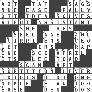 ACROSS 1. Small island 4. Make lace 7. Settles 11. Compass dir. 12. Relaxation 13. Friendly 14. Baseball player Mel 15. The content of cognition 16. Finds the solution 17. Eskimo relative 19. Helper 21. A female animal or person 23. Angers 24. Sew up the eyelids of hawks and falcons 25. Ripen 26. Leather borer 29. High-altitude cloud 30. Followers of ems 31. Corporate head (abbr.) 32. Allow 33. Big collection agency 34. Hit sharply and swiftly 35. Compass dir. 36. _-fi 37. Showery time 40. ___ a Wonderful Life 41. Area sheltered from the wind 42. Frog relative 43. Glance over 45. Fitting 46. Conclusion 51. Prying instrument 55. Foolish or stupid persons 56. "You Light Up My Life" star Conn 58. Single 59. Impressive in appearance 60. Liveliness 61. Wedding promise 62. Celtic language 63. Lair 64. Two (Sp.) DOWN 1. Small Philippine buffalo 2. International (abbr.) 3. Wig 4. Small boy 5. At sea 6. Afternoon social gatherings 7. Table seasonings 8. Inventor's middle name 9. Small, secluded valley 10. System (abbr.) 12. One or the other 13. Airs 16. Titles for men of rank and authority 18. One who makes use of a thing 20. Public displays of written messages 22. Biblical high priest 24. Settings 25. Nest on high 26. Sour-tasting 27. Welt 28. Trim (branches) 29. Penny 32. Luau accessory 33. Ancient Celtic tribe of eastern Britain 36. Narrow boards 37. "One Day ___ Time" 38. Cotton for raincoats, e.g. 39. Pace 43. Fur scarf 44. Quote 46. Trig term 47. Aroma 48. Chest bones 49. Wrote a lyric poem 50. The longest river in the world 52. State of nonexistence 53. Inside; within (prefix) 54. Vintage cars 57. Daniel's nick name