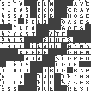 ACROSS 1. Stalk of a moss capsule 5. Shade tree 8. "___ Maria" 11. Entreaties 13. Sometimes accompanies a hiss 14. Supercomputer manufacturer 15. Slender Brazilian palm 16. Globe 17. Stockings 18. Fish or hair follower 19. Painter Guido (1575-1642) 21. Fertile tracts in a desert 22. It may be bright or harebrained 24. Moves 25. Buttonhole 27. Had dinner 29. Friends 30. Cements 32. Woody plant 33. Maternal 35. Nanny 39. Postpone 41. Sign of something about to happen 42. "One Day ___ Time" 43. Had an oblique or slanted direction 45. Allows 48. ____ d'Azur (French Riviera) 49. A piece of turf (Scot.) 50. Musical group of three 52. Reproach for some lapse or misdeed 55. Came down and settled, as after flight 56. The 19th letter of the Greek alphabet 57. Pulls apart 59. Cause heat under the collar 60. Pipe bend 61. Gurus 62. Double-curved letter 63. Adept person 64. Respite DOWN 1. Connect, as a bridge 2. Otherwise 3. A testis 4. American Automobile Association (abbr.) 5. Inky black, to poets 6. Australian parrot (variant) 7. Disorderly crowd 8. Came up 9. Flower holders 10. Sight organs 12. Fathers 14. US Secretary of Labor Elaine L. _ 20. Erode 21. Double curve, resembling the letter S 23. Administered medicine 25. Fitting 26. Automobile 27. The first octave above the treble staff 28. Third day of the wk. 30. Slender fish 31. Snob 33. Newt 34. Teachers' org. 36. Electrical Measurement 37. Born 38. Added to 40. 90 degrees 43. _-fi 44. Plunders 45. Ms. Damita and namesakes 46. Vices 47. Lug 49. Have the gumption 50. Baby powder 51. Governing power 53. Ancient Greek god of war 54. Inconspicuous attention getter 56. Afternoon social gathering 58. Ewer handle