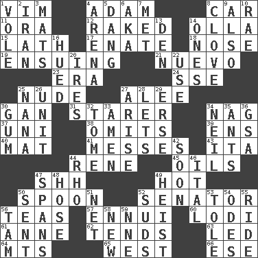 ACROSS 1. Zeal 4. First of billions? 8. 4-wheeled motor vehicle 11. Mouth or opening 12. Moved through 14. Spanish pot 15. Thin strip of wood or metal 17. Maternal 18. Characteristic smell of wine 19. Taking place subsequently 21. New (sp.) 23. Period 24. Compass dir. 25. Naked 27. Toward shelter 30. Separate the seeds from cotton 31. A viewer who gazes fixedly 34. Tired old horse 37. Single; one (prefix) 38. Leaves out 39. Followers of ems 40. Floor protector 41. Makes clutter 43. Call ___ day 44. French philosopher Descartes 45. Petroleums 47. Quiet! 49. Being at a high temperature 50. Soup utensil 52. Elected representative 56. Beverages made from leaves 57. World-weariness 60. Farming town in central California 61. Singer Murray 62. Is inclined (to) 63. Directed 64. Mountains (abbr.) 65. Compass direction 66. Compass dir. DOWN 1. Short-tailed, large-bodied rat 2. SW Asia republic 3. Floor protectors 4. Sports stadium 5. Mild oath, euphamism for damn 6. Alias (abbr.) 7. Was introduced to 8. Garlic unit 9. In addition 10. Actress Charlotte 13. Lair 14. Washington bills 16. Took on color 20. Angers 22. Purpose 25. Nanny 26. A single undivided whole 27. Ascend 28. Allows 29. Celtic language 30. Chewing product 32. Heavy book 33. So be it 34. Famous astronaut Armstrong 35. Pismires 36. Girls' org. (abbr.) 42. Within a short period 44. 17th letter of the Greek alphabet 46. Slanted text style (abbr.) 47. Connects, as a bridge 48. Flexible conduit 49. Robbery 50. Emitted 51. Remaining after all deductions 52. Soap bubbles 53. Lacquered or enameled metalware 54. Lyric poems 55. Travel on an animal 56. Scottish cap 58. ___ Haven, CT 59. Compass dir.