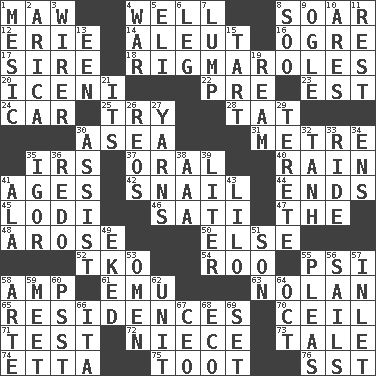 ACROSS 1. Informal term for the mouth 4. Not ill 8. Fly high 12. 4th largest of the Great Lakes 14. Eskimo relative 16. Legendary monster 17. The founder of a family 18. Complicated, petty procedures 20. Ancient Celtic tribe of eastern Britain 22. Before (prefix) 23. Eastern Standard Time (abbr.) 24. Auto 25. Attempt to accomplish something 28. Make lace 30. At sea 31. Distance measurement (Brit.) 35. Big collection agency 37. Spoken 40. Precipitation 41. Grows older 42. Slow-paced one 44. Conclusions 45. Farming town in central California 46. Suttee (variant) 47. Definite Article 48. Came up 50. Otherwise 52. Ring climax 54. Friend of Pooh 55. Air pressure measure (abbr.) 58. Electrical Unit 61. Australian flightless bird 63. Pitcher Ryan 65. Dwellings 70. To provide with a ceiling 71. Trial 72. Sibling's daughter 73. Lie 74. Singer James 75. A blast of a horn 76. Fast jet (abbr.) DOWN 1. Of or pertaining to a meson 2. N. Chile seaport 3. One who wires 4. Armed conflict 5. Biblical high priest 6. Part of a journey 7. Mass 8. "Barney Miller" actor Jack 9. Stare 10. Ancient Greek god of war 11. Relief 13. Car or cant ending 15. Small pie 19. 480, 500 or 516 sheets of paper 21. ___ a Wonderful Life 26. Vintage cars 27. Tall tales 29. Cylindrical with tapered ends 30. Aid 32. Hyperbolic tangent 33. Travel on or in a vehicle 34. Followers of ems 35. Russian composer Stravinsky 36. Do over again 38. Auto club (abbr.) 39. 61 cubic inches 41. Wing 43. _ and Stitch 49. Supplemented with great effort 51. Manchild 53. Presage 55. Entreaties 56. Moves on water 57. An arm off of a larger body of water 58. Johnson of "Laugh-In" 59. Confront 60. Inconspicuous attention getter 62. A single undivided whole 64. Sep. follower 66. Call ___ day 67. Corporate head (abbr.) 68. Environmental prefix 69. Put into a specified state