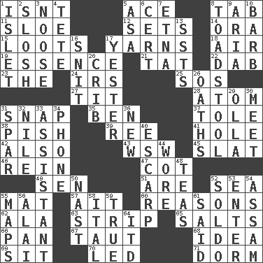 ACROSS 1. Is not 5. Adept person 8. Bar bill 11. _ gin 12. Arranges properly for use 14. Mouth or opening 15. Plunders 17. Entertaining tales 18. Atmosphere 19. Center 21. Make lace 22. Pat or tap gently 23. Definite Article 24. Big collection agency 25. Distress signal 27. Teat (slang) 28. Tiny particle 31. Fastener 35. Benjamin's nick name 37. Lacquered or enameled metalware 38. Expression of disdain 39. To riddle 41. Opening into or through something 42. In addition 43. Compass dir. 45. Narrow board 46. It's straight from the horse's mouth 47. Small bed 49. Elected rep. 51. "We ___ not amused" (Victoria) 52. Ocean 55. Floor protector 57. Small island 60. Thinks logically 62. Chicken ___ king 63. Empty completely 65. Table seasonings 66. Baking dish 67. Tense 68. The main thing one is thinking about 69. Be seated 70. Directed 71. Dormintory (informal) DOWN 1. Small island 2. Make a splashing sound 3. Trap for birds or small mammals 4. False hair 5. White ___ sheet 6. Certainty 7. Inactive volcano in Sicily 8. Inedible or poisonous agaric 9. Operatic vocal solo 10. Sharp remark 13. Fast planes 16. In a ____ (agitated or irritated) 17. Next before 20. Baby bed with high sides 26. Curses 29. Rounded earthenware pot or jar 30. Rendezvous 31. Coast Guard woman 32. Mediterranean tributary 33. Helper 34. Give a jingle 36. ___ Haven, CT 40. Fortification 44. Had on 48. Beverages made from leaves 50. Political cartoonist Thomas 52. Twentieth part of a lira 53. Keyboard key 54. Indian state 55. Atlas contents 56. Mountain range southwest of Kyrgyzstan 58. Slanted text style (abbr.) 59. Loyal 61. Stated 64. It would