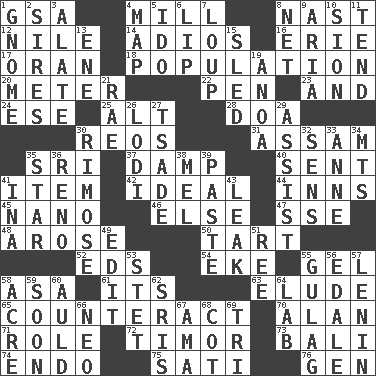 ACROSS 1. Girls' org. (abbr.) 4. Place where flour is made 8. Political cartoonist Thomas 12. The longest river in the world 14. Goodbye (Sp.) 16. 4th largest of the Great Lakes 17. Northwest Algerian city 18. Census information 20. Distance measurement 22. Fenced enclosure 23. Also 24. Compass dir. 25. Keyboard modifier key 28. ___ good deed 30. Vintage cars 31. Indian state 35. _ Lanka 37. Moist 40. Posted 41. A distinct part 42. Perfect 44. Taverns 45. Billionth: prefix 46. Otherwise 47. Compass dir. 48. Came up 50. Small pie 52. Begley and Asner 54. Make supply last 55. Set 58. White ___ sheet 61. It is 63. Evade 65. Frustrate 70. ____ Jay Lerner 71. Hero or heavy, e.g. 72. Southeast Indonesia island 73. Indonesian resort city 74. Inside; within (prefix) 75. Suttee (variant) 76. Commissioned mil. rank DOWN 1. Dwarf 2. Founders of families 3. Having winglike extensions 4. Atlas unit 5. Wedding promise 6. Mouth edge 7. Central Nebraska county 8. Fish or hair follower 9. Operatic vocal solo 10. The Jewish people; Israel 11. Watch over 13. Compass dir. 15. Downhill vehicle 19. Small Philippine buffalo 21. Actress Charlotte 26. Farming town in central California 27. Sadhe (variant) 29. Aid 30. Full of chinks, cracks, or crevices 32. Elected reps. 33. Queen of England 1702-14 34. Mountains (abbr.) 35. Play the lead 36. Western Nevada city 38. Cartoonist voice _ Blanc 39. Thick mixture 41. _ tizzy (2 wds.) 43. Path through which fluid escapes 49. Prepare for publication 51. To separate or throw off 53. Proofreading order 55. Russian prison camp 56. Peak District village in England 57. Soviet premier 1918-24 58. 1/640 square mile 59. Within a short period 60. Old (Scot.) 62. Indian titles of respect 64. Experiment locale 66. Modern: prefix 67. Housemaid (var.) 68. Small bed 69. Three (prefix)