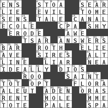 ACROSS 1. Followers of ems 4. Portico 8. Scorch 12. Untruth 13. Morally bad or wrong 14. Heavy book 15. Elected reps. 17. Lie 18. Lessep's creation 19. Learning spot: Fr. 21. Accounting whiz (abbr.) 23. Like a shrinking violet 24. Wear away 26. Deep reverence 28. Russian ruler of old 30. Replies 34. Long, evenly shaped piece 37. Writer of Portnoy's Complaint (1969) 39. Writer Wiesel 40. "___ Maria" 41. Male parents of animals 43. The first octave above the treble staff 44. Actor's bit 46. One who doesn't tell the truth 47. Teachers' org. 48. Under perfect conditions 51. "Vaya con ____" 54. Friend of Pooh 55. Virtuous person 58. Small child 61. Elect 63. Plants 65. Eskimo relative 67. Arabian gulf 71. Mouths or openings 72. Monthly bill 73. Undercover agent 74. Madame (abbr.) 75. Carry 76. Light colored 77. Health resort DOWN 1. Otherwise 2. Sibling's daughter 3. Sir (Sp.) 4. Put into a specified state 5. Federal power corp. 6. Petroleum 7. Actor Baldwin 8. R.R. building 9. Immeasurably long periods of time 10. Wet nurse 11. Have confidence or faith in 16. Position in a hierarchy or organization 18. Crow sounds 20. Begley and Asner 22. Baking dish 25. Hearing organs 27. She-sheep 29. Agitated, as a liquid 30. At or in the front 31. Liveliness 32. Cause heat under the collar 33. Stalk of a moss capsule 34. Indonesian resort city 35. Enthusiastic 36. French philosopher Descartes 38. Three (prefix) 42. Indian titles of respect 45. Hearing organ 49. Plunder 50. Chop off 52. Clumsy lout 53. Grain storage tower 56. Typical standards 57. _____ steamer (cargo ship) 58. Small pie 59. Butter sub 60. Portable shelter 62. Pack (down) 64. Toward the sea 66. Shoshoni 68. ___ good deed 69. Pipe bend 70. Born