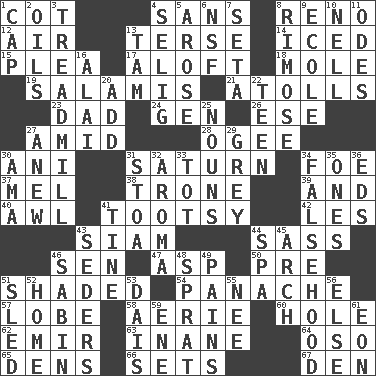 ACROSS 1. Small bed 4. Without 8. Western Nevada city 12. Wind 13. Laconic 14. On the rocks 15. Entreaty 17. Upward 18. Undercover agent 19. Deli grouping 21. Ringlike coral islands and reefs 23. Male parent 24. Commissioned mil. rank 26. Compass dir. 27. Among 28. Double curve, resembling the letter S 30. Cuckoo 31. Titan orbits this 34. Enemy 37. Cartoonist voice _ Blanc 38. Heavy duty weighing machine 39. Added to 40. Leather borer 41. Tootsie (variant) 42. French article 43. Thailand, formerly 44. Backtalk 46. Elected rep. 47. Viper 50. Before (prefix) 51. Cast a shadow over 54. Flamboyance 57. Ear part 58. Nest on high 60. Opening into or through something 62. Independent ruler or chieftain 63. Silly 64. Bear (Spanish) 65. Hiding places for outlaws 66. Arranges properly for use 67. Lair DOWN 1. Head covering 2. Lubricates 3. Excercise machine 4. Major League Baseball Commissioner Bud 5. Came up 6. Overdraft (abbr.) 7. Bristle 8. Full of chinks, cracks, or crevices 9. Learning spot: Fr. 10. 1994 drama film starring Jodie Foster 11. Lyric poems 13. Scottish cap 16. Mountain range southwest of Kyrgyzstan 20. Say or write further 22. Adolescent 25. Parts of speech 27. Afresh 29. Jennifer or Joel 30. Wet nurse (var.) 31. Portico 32. Scent 33. Small child 34. It jiggles the polygraph 35. Washington bills 36. Begley and Asner 41. Prong on a fork 43. Spring feasts 44. Health resort 45. Bowlike part 46. Unit of acoustic absorption 48. Small fatty European fish 49. Aches 51. Downhill vehicle 52. Dwelling 53. Raised platform 55. Born 56. Otherwise 59. Compass dir. 61. A really long time