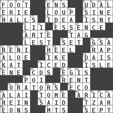 ACROSS 1. Lowest support of a structure 5. Followers of ems 8. Hereditary estate 12. 4th largest of the Great Lakes 13. Central Nebraska county 15. Trig term 16. Promenades 18. It may be bright or harebrained 19. Is not 20. Cards in a Roman deck? 22. Substance 24. Johnson of "Laugh-In" 26. Label 27. For fear that 28. Put into a specified state 29. Girls' org. (abbr.) 32. Painter Guido (1575-1642) 35. The bottom of a shoe or boot 37. Reproach for some lapse or misdeed 38. Medicinal plant 39. Mamie's mate 40. Raised platform 41. Krazy ___ of comics 42. On the rocks 43. Small island 44. Compass dir. 45. Music discs 46. Armor plate that protects the chest 49. Luau course 50. Monthly bill 51. Speakers 55. Environmental prefix 56. Jai _ 57. Heavy book 59. N. Chile seaport 63. It's straight from the horse's mouth 64. Stated 65. Russian ruler 66. Immeasurably long periods of time 67. Mountains (abbr.) 68. Back-to-school mo. DOWN 1. Opposite of masc. 2. Mouth or opening 3. Petroleum 4. Copy Pinocchio 5. Biblical high priest 6. Connecting point 7. Takes to court 8. Exploiting 9. Plate 10. Queen of England 1702-14 11. Allow 14. Soft color 17. Father 21. It is 23. Ingest 25. Principles of right and wrong 28. Sowing specialist 29. Pate de foie ____ 30. Move on water 31. Domed church section 32. Libertine 33. Enthusiasm 34. Musical sound 36. Supplement with great effort 40. What propaganda does 42. Foolish or stupid persons 45. Small bed 47. Turn to the right 48. South American Indian 49. Aches 51. Margarine 52. Precipitation 53. Wander 54. Stricken, poetically 56. "We ___ not amused" (Victoria) 58. Begley and Asner 60. Ending with capital 61. Head covering 62. Nonscientific branch of learning