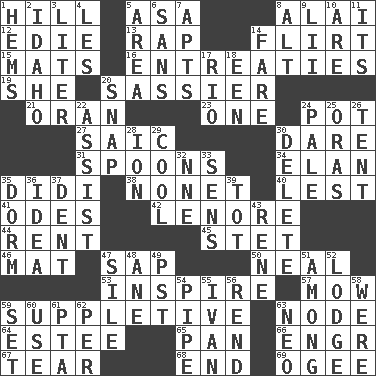 ACROSS 1. Land elevation 5. White ___ sheet 8. Jai _ 12. Singer Brickell 13. Hit sharply and swiftly 14. Seductive woman who exploits men 15. Floor coverings 16. Pleas 19. A female animal or person 20. More disrespectful 21. Northwest Algerian city 23. Single 24. Cooking vessel 27. Ketch in the Levant 30. Have the gumption 31. Soup utensils 34. Liveliness 35. "You Light Up My Life" star Conn 38. Music written for nine 40. For fear that 41. Lyric poems 42. Poe poem 44. Monthly bill 45. Proofreading order 46. Floor covering 47. Plant excrement 50. Be tempered by heat 53. Motivate 57. Cut the grass 59. Supplying deficiencies 63. Connecting point 64. First name in cosmetics 65. Baking dish 66. Engineer (abbr.) 67. Rend 68. Conclusion 69. Double curve, resembling the letter S DOWN 1. Is hesitant and indecisive 2. Potato state 3. 61 cubic inches 4. French article 5. Type of rug 6. Without 7. Tenement units (abbr.) 8. Keyboard modifier key 9. Cards in a Roman deck? 10. "We ___ not amused" (Victoria) 11. It is 14. Conductor's collection 17. _ de Janeiro 18. Car or cant ending 20. Fastener 22. Help 24. Diluted with white 25. Mouths or openings 26. Portable shelter 28. Electrically charged atom 29. Calm and collected 30. Erase 32. Compass dir. 33. Elected reps. 35. Dormintory (informal) 36. The content of cognition 37. Undesirable depression on a surface 39. Small child 43. French philosopher Descartes 47. Drop; flow; fall 48. A saturated hydrocarbon 49. Pacific Standard Time (abbr.) 51. Amid 52. Inn 54. Corncob 55. _ the terrible 56. Tear apart 58. We are 59. Put into a specified state 60. Purpose 61. Parent Teacher Assoc. 62. For each 63. Modern: prefix