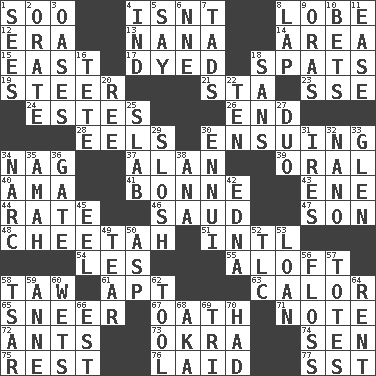 ACROSS 1. "Barney Miller" actor Jack 4. Is not 8. Ear part 12. Epoch 13. Grandmother 14. Length times width 15. Compass direction 17. Colored 18. Arguments over trivial matters 19. Bull 21. R.R. building 23. Compass dir. 24. _____ Park, CO 26. Conclude 28. Snakelike fish 30. Taking place subsequently 34. Tired old horse 37. ____ Jay Lerner 39. Of the mouth 40. Nanny (var.) 41. Maid-servant 43. Compass dir. 44. Pace 46. Saudi Arabian king (1953-1964) 47. Manchild 48. Leopard's kin 51. International (abbr.) 54. French article 55. At or to great height 58. The 23rd letter of the Hebrew alphabet 61. Fitting 63. Bodily heat indicating an inflammation 65. Contemptuous expression 67. Pledge 71. Musical sound 72. Pismires 73. Gumbo ingredient 74. Elected rep. 75. Relief 76. Put down 77. Fast jet (abbr.) DOWN 1. Perceives with the eye 2. Declaim 3. Fertile tracts in a desert 4. Indiana (abbr.) 5. Declare 6. Compass dir. 7. Bits 8. Pet locale 9. Mouths or openings 10. Antes 11. Relaxation 16. Wig 18. Without 20. To riddle 22. Nine, plus one 25. Broad, flat, thick piece 27. Superhero pair 29. Splash clumsily 30. World-weariness 31. Angers 32. Billionth: prefix 33. Small, secluded valley 34. Drug cop 35. Nanny 36. Yard entry 38. Santa ___, CA 42. Pulitzer Prize-winning author Ferber 45. Snakelike fish 49. Rend 50. Cleo's killer 52. Affectionate concern, for short 53. Grant temporary use of 56. Soft thread for cleaning between teeth 57. Hauls 58. Russian ruler of old 59. Singer Murray 60. Soaks 62. Instrument 64. Monthly bill 66. Eastern Standard Time (abbr.) 68. Alias (abbr.) 69. Three (prefix) 70. Possessed