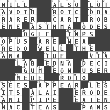 ACROSS 1. Place where flour is made 5. In addition 9. Car dealer's back yard 12. Prevent from happening 14. College mil. group 15. Chief or king in Benin or Nigeria 16. More uncommon 17. Haul 18. Director Reiner 19. Compass dir. 20. Respiratory problem 23. Lyric poems 24. Stare at amorously 25. Naughty children 27. Musical composition 30. "We ___ not amused" (Victoria) 32. Teachers' org. 33. Do over again 34. Not ill 36. Definite Article 38. Santa ___, CA 39. Third day of the wk. 40. By way of 43. Experiment locale 46. Pulitzer Prize-winning author Ferber 48. Tenth: prefix 49. Chewing product 51. Period of immesurable duration 52. One who uses or employs something 53. Ancient Persian 54. Printing process, for short 56. Perceives with the eye 58. Seem 61. French article 64. It is 65. Mountain range southwest of Kyrgyzstan 66. Eat (away) 68. Black tropical American cuckoo 69. Corncob 70. Consumed 71. Apple computer (short form) 72. Beverages made from leaves 73. Zero-star reviews DOWN 1. Female horse 2. "Terrible" tsar 3. Old wives' tales, e.g. 4. Falsehood 5. Bowlike part 6. Rich soil 7. Put through a sieve 8. Sep. follower 9. Domineers 10. Mitch Miller's instrument 11. Bar bills 13. To be drawn or hauled along 21. Cole _ (cabbage dish) 22. Cylindrical with tapered ends 23. Brightly colored fish 24. Bear (Spanish) 26. Was introduced to 27. Mouth or opening 28. Writing instrument 29. Freehold land 31. Evade 35. Poe poem 37. Nights before holidays 41. Frozen water 42. Wind 44. Matures 45. Partially opened flower 47. Small Philippine buffalo 48. Superhero pair 50. Ear of corn 53. Of or pertaining to a meson 55. Relationship diagram 56. Thailand, formerly 57. Inactive volcano in Sicily 59. Dad 60. Sliced desserts 61. Globular water bottle used in Asia 62. Genesis locale 63. Elected reps. 65. Fitting 67. Hit sharply and swiftly