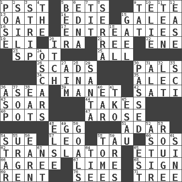 ACROSS 1. Inconspicuous attention getter 5. Antes 9. False hair 13. Pledge 14. Singer Brickell 15. An organ shaped like a helmet 16. Beget 17. Pleas 19. Biblical high priest 20. Lyricist Gershwin 21. To separate or throw off 22. Compass dir. 23. Blemish 25. Everything 26. Loads 30. Friends 34. Large country 35. Actor Baldwin 36. Toward the sea 39. French painter Edouard 42. Suttee (variant) 43. Fly high 44. Proceeds 46. Plant holders 47. Came up 48. Oval reproductive body of a fowl 51. The sixth month of the Jewish calendar 54. Institute legal proceedings 57. Lion 58. The 19th letter of the Greek alphabet 60. Distress signal 62. Interpreter 65. Needle case 66. Match 67. Citrus frut 68. Omen 69. Monthly bill 70. Observes 71. Family _ (genealogy) DOWN 1. Airs 2. Moves on water 3. Empty completely 4. Definite Article 5. Fermented drink made from hops 6. Pulitzer Prize-winning author Ferber 7. Teat (slang) 8. Spanish missionary in California 9. Make lace 10. Writer Wiesel 11. Adolescent 12. Relaxation 15. Highlander 18. Snakelike fish 20. Hankering 24. Motion picture awards 27. Direct toward a target or goal 28. Heredity factor (abbr.) 29. Before Barbara or Clara 30. Went by 31. According to 32. Allow 33. _-fi 36. Viper 37. "Barney Miller" actor Jack 38. Consume 40. Hearing organ 41. Ring climax 45. Son of Isaac 48. Otherwise 49. Set 50. Scores awarded for successful feats 52. Moving or stirring 53. Makeup applied to the cheeks 54. Play the lead 55. Goad 56. Merit 58. Heavy book 59. Ancient Greek god of war 61. Trig term 63. Remaining after all deductions 64. Make a knot 65. Eastern Standard Time (abbr.)