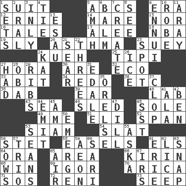 ACROSS 1. Set or collection 5. Lettered men learn these first 9. Period 12. Bert's buddy 14. Female horse 15. And not 16. Stories 17. Toward shelter 18. Basketball assoc. 19. Playfully artful 20. Respiratory problem 23. Chop _ 24. Malaysian steamed pastry 25. Native american tent (variation) 27. Israeli folk dance 30. "We ___ not amused" (Victoria) 32. Environmental prefix 33. "This won't hurt ____!" 34. Do over again 36. And so on (abbr.) 38. Pat or tap gently 39. Ewer handle 40. Experiment locale 43. Ocean 46. Downhill vehicle 48. Flatfish 49. Madame (abbr.) 51. Biblical high priest 52. Connect, as a bridge 53. Thailand, formerly 54. Narrow board 56. Proofreading order 58. Artist's stands 61. Raised railways 64. Mouth or opening 65. Type of rug 66. Japanese brewing company 68. Victory 69. Russian composer Stravinsky 70. N. Chile seaport 71. Mayday 72. Painter Guido (1575-1642) 73. Ooze DOWN 1. Arranges properly for use 2. Mountain range 3. In an inward manner 4. Neckwear 5. Nanny 6. Lip ointment 7. Make 8. Observe 9. World-weariness 10. Loose flowing garment 11. Like ___ of sunshine 13. Son of Isaac 21. Shrivel 22. Threesomes 23. Specific locale 24. Krazy ___ of comics 26. Frozen water 27. Possessed 28. Chief or king in Benin or Nigeria 29. Chest bones 31. Peak District village in England 35. Threatening words 37. Hoof sound 41. Insect wing 42. Benjamin's nick name 44. Give off 45. Wet nurse (var.) 47. Deli pickle 48. Fast jet (abbr.) 50. Develop 53. Actors Connery and Penn 55. "____ silly question..." 56. Sty mamas 57. Musical group of three 59. A really long time 60. Indian skirt 61. 4th largest of the Great Lakes 62. Louse (plural) 63. Fastener 65. Atmosphere 67. Big collection agency