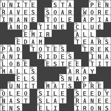 ACROSS 1. Join together 6. R.R. building 9. Fenced enclosure 12. All-night dance parties 13. Fly high 14. Had on 15. Silly 16. Lacquered or enameled metalware 17. Capital of Western Samoa 18. Plus 19. Prong on a fork 20. A slight indication 21. Arab leader 23. Everything 24. Dutch treat 25. Pulls into pieces 28. Groovy apt. 30. Hauls 34. Long journey 35. Black tropical American cuckoo 36. Amusement-park features 38. _ tizzy (2 wds.) 39. Ear part 41. First name in cosmetics 43. Teat (slang) 44. Shopping centers 46. Like ___ of sunshine 48. Raised railways 49. Fastener 50. A single undivided whole 51. Floor protectors 53. Before (prefix) 56. Butter sub 57. Drop; flow; fall 58. Morally degraded 60. Political cartoonist Thomas 61. Narrow board 62. The wife of a rajah (variant) 63. Followers of ems 64. Biblical high priest 65. Metal shackles DOWN 1. RI univ. 2. Nanny 3. _ the terrible 4. Looked after 5. Compass dir. 6. Within a short period 7. Story 8. "We ___ not amused" (Victoria) 9. Teen's desire 10. One of the Great Lakes 11. Teachers' org. 13. Agitate 14. Place for singles 19. The easternmost of the Lesser Sundas 20. Domesticated feline 22. Floor covering 24. The property of being fit to eat 26. Painter Guido (1575-1642) 27. Three-handed card game 28. Inside of hand 29. Small Philippine buffalo 31. Make a knot 32. Begley and Asner 33. Put into a specified state 37. Actors Connery and Penn 40. American author Paul (1891-1958) 42. Period 45. Fast jet (abbr.) 47. Become visible 49. Proofreading order 50. ____ Bator, Mongolia 51. Place where flour is made 52. Jai _ 54. Former U.S. Attorney General Janet 55. Genesis locale 56. Single 57. Compass dir. 58. _ Lanka 59. Affirmative reply