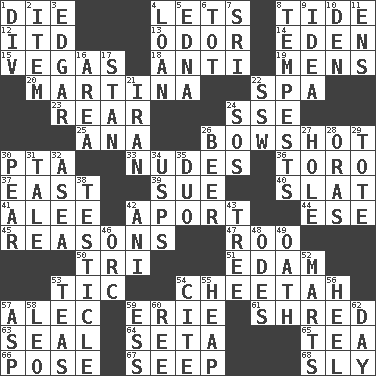 ACROSS 1. Expire 4. Allows 8. Event that recurs at intervals 12. It would 13. Aroma 14. Paradise 15. Viva Las _ 18. Against 19. Not women's 20. Chrissie's court nemesis 22. Health resort 23. Bring up, as a child 24. Compass dir. 25. Santa ___, CA 26. The distance a bow sends an arrow 30. Parent Teacher Assoc. 33. Unclothed pictures 36. "Corrida" creature 37. 90 degrees 39. Take to court 40. Narrow board 41. Toward shelter 42. To the left, to Queeg 44. Compass dir. 45. Thinks logically 47. Friend of Pooh 50. Three (prefix) 51. Dutch treat 53. Nervous spasm 54. Leopard's kin 57. Actor Baldwin 59. 4th largest of the Great Lakes 61. Fragment 63. Lick closed 64. Bristle 65. Beverage made from leaves 66. Introduce or present, as a question 67. Ooze 68. Wily DOWN 1. HTML Container Element 2. Detail 3. _ Allan Poe 4. Grant temporary use of 5. Pulitzer Prize-winning author Ferber 6. Small child 7. Indian title of respect (Mr.) 8. Storms 9. The main thing one is thinking about 10. Lair 11. Followers of ems 16. Type of rug 17. Comedian Laurel of Laurel & Hardy 21. SW Asia republic 22. Compass dir. 24. Distress signal 26. Fermented drink made from hops 27. Hollow 28. Mouths or openings 29. Lug 30. Lightbulb-shaped fruit 31. Story 32. Toward the sea 34. United States Postal Service (abbr.) 35. Superhero pair 38. One of the two male reproductive glands 42. Black tropical American cuckoo 43. Woody plant 46. The grampus (Milton) 48. Lyric poems 49. Pledge 52. Shops 53. Beverages made from leaves 54. Quote 55. Pile 56. The bottom of a shoe or boot 57. Viper 58. Lion 59. Double-curved letter 60. To separate or throw off 62. 24 hours