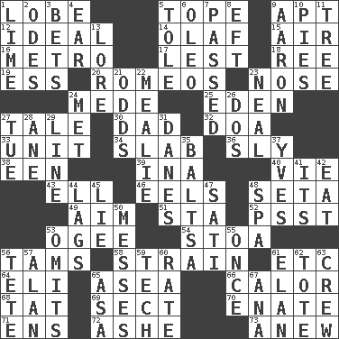 ACROSS 1. Ear part 5. Drink excessively 9. Fitting 12. Standard of perfection 14. Norwegian king 15. Atmosphere 16. Paris' subway 17. For fear that 18. To separate or throw off 19. Double-curved letter 20. Lover boys 23. Olfactory organ 24. Ancient Persian 25. Genesis locale 27. Falsehood 30. Male parent 32. ___ good deed 33. A single undivided whole 34. Broad, flat, thick piece 36. Mischievous 38. Car or cant ending 39. _ tizzy (2 wds.) 40. Compete 43. Pipe bend 46. Snakelike fish 48. Stalk of a moss capsule 49. Direct toward a target or goal 51. R.R. building 52. Inconspicuous attention getter 53. Double curve, resembling the letter S 54. Portico 56. Scottish caps 58. Put through a sieve 61. And so on (abbr.) 64. Biblical high priest 65. At sea 66. Bodily heat indicating an inflammation 68. Make lace 69. Religious group 70. Related on the mother's side 71. Followers of ems 72. American tennis player Robert 73. Afresh DOWN 1. Citrus frut 2. Lyric poems 3. Stakes 4. Hearing organ 5. Lacquered or enameled metalware 6. Margarine 7. Went by 8. Lizard (obsolete) 9. Composer Copland 10. Sliced desserts 11. Family _ (genealogy) 13. Old wives' tales, e.g. 21. Probability 22. Ear of corn 23. Be tempered by heat 24. Was introduced to 26. Two (Sp.) 27. Third day of the wk. 28. One (Scot) 29. Actor's bit 31. Natives or inhabitants of Denmark 35. Greek mezzo-soprano Agnes 37. Jacques Cousteau's middle name 41. ___ a Wonderful Life 42. Consume 44. Fails to keep up a pace 45. Falsehood 47. Suttee (variant) 48. Health resort 50. Makes clutter 53. Leaves out 55. Single time 56. Wig 57. ____ Jay Lerner 59. Technician 60. Pace 61. Flair 62. Lug 63. Ship's personnel 65. White ___ sheet 67. Santa ___, CA