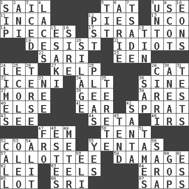 ACROSS 1. Move on water 5. Make lace 8. Purpose 11. South American Indian 12. Sliced desserts 13. Non-commissioned officer (abbr.) 14. Parts 17. Ski resort town in Vermont 19. Cease 21. Foolish or stupid persons 22. Indian skirt 23. Car or cant ending 24. Allow 27. Seaweed 29. Domesticated feline 32. Ancient Celtic tribe of eastern Britain 34. The first octave above the treble staff 36. Trig term 37. Greater amount 38. Turn to the right 39. Ancient Greek god of war 40. Otherwise 41. Hearing organ 42. Small fatty European fish 43. Observe 44. Stalk of a moss capsule 46. Big collection agency 47. Opposite of masc. 50. Portable shelter 52. Unrefined 55. Gossips 57. One to whom something is allotted 59. Break 62. Luau accessory 63. Snakelike fish 64. Greek god of love 65. Car dealer's back yard 66. _ Lanka 67. Plant excrements DOWN 1. Small drink 2. Cuckoo 3. On the rocks 4. Shoestrings 5. Teat (slang) 6. Nest on high 7. Sadhe (variant) 8. To (old English) 9. Native of Scotland 10. Immeasurably long periods of time 12. Pacific Standard Time (abbr.) 15. 1973 Nobel Price Winner (Physics) Leo 16. Father 18. Metal container 20. Fodder prepared in a silo 24. Citrus fruits 25. Learning spot: Fr. 26. Laconic 28. Entreaties 29. High-altitude cloud 30. Approach 31. Trials 33. Born 35. Cylindrical with tapered ends 36. Plant excrement 42. Before Barbara or Clara 45. Look after 47. Back 48. _____ Park, CO 49. Distance measurement 51. Corrects by punishment or discipline 52. Give a ring to 53. Margarine 54. Set down 55. Affirmative reply 56. "Two Mules for Sister ____" 58. Biblical high priest 60. Republican Party 61. Double-curved letter