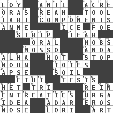 ACROSS 1. Myrna of the movies 4. Opposed to 8. 1/640 square mile 12. Mouths or openings 14. 480, 500 or 516 sheets of paper 15. Instrument 16. Small pie 17. Pieces 20. Queen of England 1702-14 21. Frozen water 22. Enemy 23. Remove all contents or possession from 27. Rend 29. Taken by mouth 31. Crowds into 34. With motion or animation 35. Small Philippine buffalo 36. _ mater 39. Being at a high temperature 41. Close up, plug up 42. Part of speech 43. Lugs 46. Domed church section 47. Earth 48. Needle case 51. Trials 54. Was introduced to 56. Three (prefix) 58. It's straight from the horse's mouth 61. Pleas 66. Capital and largest city of Mongolia 67. The main thing one is thinking about 68. The sixth month of the Jewish calendar 69. Greek god of love 70. Characteristic smell of wine 71. Australian parrot (variant) 72. Nonscientific branch of learning DOWN 1. Globular water bottle used in Asia 2. NW Algerian seaport 3. Entertaining tales 4. Curve 5. Modern: prefix 6. Scottish cap 7. Body of Kaffir warriors 8. Had dinner 9. Meet 10. Printing process, for short 11. Otherwise 13. Proofreading order 18. Sep. follower 19. Born 24. Friend of Pooh 25. Big collection agency 26. Romantic infatuation 28. Collect or gather 30. Plunders 32. Surprise greeting 33. Plant excrement 34. French painter Edouard 36. Santa ___, CA 37. Trim (branches) 38. French bagpipes 40. A blast of a horn 44. Neckwear 45. Raised railways 49. Shoshoni 50. Lyricist Gershwin 52. Loyal 53. Father Junipero _ 54. Chow _ 55. Inside; within (prefix) 57. Slanted text style (abbr.) 59. Composer Stravinsky 60. Political cartoonist Thomas 62. Actress Charlotte 63. Wedding promise 64. Hearing organ 65. _ Lanka