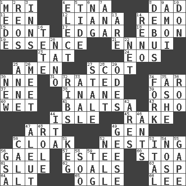 ACROSS 1. Medical imaging device (abbr.) 4. Inactive volcano in Sicily 8. Male parent 11. Car or cant ending 12. Woody, climbing, usually tropical plant 14. San ____ (Riviera town) 15. Do not 17. _ Allan Poe 18. Inky black, to poets 19. Gist 21. World-weariness 23. Make lace 24. Greek goddess of the dawn 25. So be it 27. Highlander 30. Compass dir. 31. Spoke pompously 34. Distant 37. Compass dir. 38. Empty; void 39. Bear (Spanish) 40. Dripping 41. Greek mezzo-soprano Agnes 43. 17th letter of the Greek alphabet 44. Capri or Wight 45. Immoral or dissolute person 47. Tate display 49. Commissioned mil. rank 50. Cover or conceal 52. Nestling 56. Highlander 57. First name in cosmetics 60. Portico 61. Turn sharply 62. Finish lines 63. Cleo's killer 64. Keyboard modifier key 65. Stare 66. Area sheltered from the wind DOWN 1. Ancient Persian 2. Vintage cars 3. Taverns 4. Choose 5. Periodic rise and fall of the sea level 6. Tired old horse 7. Santa ___, CA 8. To get out of a bus 9. Mine, in Marseilles 10. Spanish title 13. "We ___ not amused" (Victoria) 14. Former U.S. Attorney General Janet 16. False hair 20. Billionth: prefix 22. Fish or hair follower 25. Queen of England 1702-14 26. Rendezvous 27. Showing deterioration from age 28. Penny 29. Lyric poems 30. ___ Haven, CT 32. Teases 33. Of or related to the anus 34. Tined utensil 35. American tennis player Robert 36. Friend of Pooh 42. Ancient Greek god of war 44. Call ___ day 46. Pismires 47. Native American of Southwest Alaska 48. Hero or heavy, e.g. 49. Honkers 50. Give a ring to 51. Cask 52. 1994 drama film starring Jodie Foster 53. Slanted text style (abbr.) 54. Olfactory organ 55. Open wide 56. Girls' org. (abbr.) 58. "Barney Miller" actor Jack 59. Label
