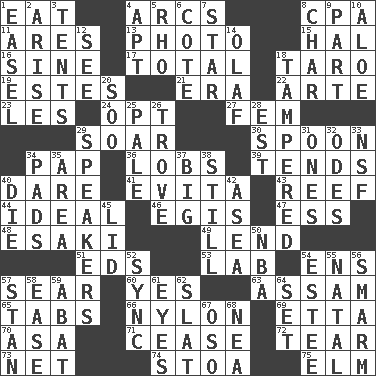 ACROSS 1. Erode 4. Curves 8. Numbers guy (abbr.) 11. Ancient Greek god of war 13. Picture 15. Actor Linden 16. Trig term 17. Add up to 18. Pacific island yam 19. _____ Park, CO 21. Period 22. Johnson of "Laugh-In" 23. French article 24. Elect 27. Opposite of masc. 29. Fly high 30. Soup utensil 34. Infant food 36. Tennis shots 39. Is inclined (to) 40. Have the gumption 41. Webber/Rice musical 43. Coral ridge 44. Standard of perfection 46. Armor plate that protects the chest 47. Double-curved letter 48. 1973 Nobel Price Winner (Physics) Leo 49. Grant temporary use of 51. Begley and Asner 53. Experiment locale 54. Followers of ems 57. Singe 60. It is so 63. Indian state 65. Bar bills 66. High-strength synthetic material 69. Singer James 70. White ___ sheet 71. Desist 72. Pull into pieces 73. Remaining after all deductions 74. Portico 75. Shade tree DOWN 1. Artist's stand 2. Originate 3. Portable shelters 4. Fitting 5. 17th letter of the Greek alphabet 6. ____ d'Azur (French Riviera) 7. Play the lead 8. Burn to charcoal 9. Piece 10. _ vera 12. Perceive with the eye 14. Norwegian king 18. ________ with (broke a safety seal) 20. "Barney Miller" actor Jack 25. Light colored 26. Collection of objects 28. Eastern Standard Time (abbr.) 29. Orators 31. Washington bills 32. Lyric poems 33. Science/research agcy. 34. Groovy apts. 35. Type of rug 37. Massive 38. Free of sound 40. Expire 42. Toward the sea 45. Flaplike covering 50. Basketball assoc. 52. Synchronize (abbr.) 54. First name in cosmetics 55. Relating to or accompanying birth 56. Excessive but superficial compliments 57. Comedian Laurel of Laurel & Hardy 58. Relaxation 59. Blind as ____ 61. Snake ____ (dice throw) 62. Narrow board 64. Put into a specified state 67. Bear (Spanish) 68. Teachers' org.