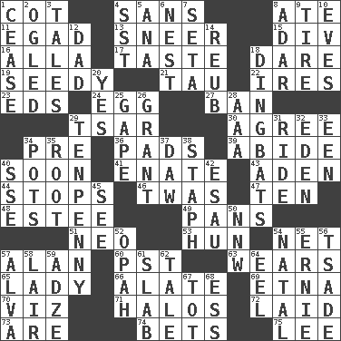 ACROSS 1. Small bed 4. Without 8. Had dinner 11. Mild oath 13. Scornful expression 15. HTML Container Element 16. Silent film actress Nazimova 17. Clothes sense 18. Have the gumption 19. Shabby and untidy 21. The 19th letter of the Greek alphabet 22. Angers 23. Begley and Asner 24. Oval reproductive body of a fowl 27. Bar 29. Russian ruler of old 30. Match 34. Before (prefix) 36. Writing tablets 39. Tolerate 40. Within a short period 41. Maternal 43. Arabian gulf 44. Ceases 46. It was, poetically 47. "___ Little Indians" 48. First name in cosmetics 49. Zero-star reviews 51. Modern: prefix 53. Attila the _ 54. Fish or hair follower 57. ____ Jay Lerner 60. Pacific Standard Time (abbr.) 63. Puts on (as clothing) 65. Kenny Rogers chart-topper in '80 66. Having winglike extensions 69. Inactive volcano in Sicily 70. To wit 71. Saint headwear 72. Put down 73. "We ___ not amused" (Victoria) 74. Stakes 75. Area sheltered from the wind DOWN 1. Desist 2. Stared at amorously 3. Lies 4. Fast jet (abbr.) 5. Santa ___, CA 6. A home for chicks 7. Stalk of a moss capsule 8. The sixth month of the Jewish calendar 9. Hoop that covers a wheel 10. Nights before holidays 12. June honoree 14. Reuben's nickname 18. Empty-headed or silly people 20. Affirmative reply 25. Open wide 26. Monetary aid 28. American Automobile Association (abbr.) 29. 3-inch nail 31. Travel on an animal 32. Genesis locale 33. Car or cant ending 34. Cooking vessels 35. Carrot, for example 37. Fool 38. Staphylococcus 40. Compass dir. 42. He sold his birthright 45. Perceive with the eye 50. Compass dir. 52. Brightly colored fish 54. Relating to or accompanying birth 55. Bert's buddy 56. Sadhe (variant) 57. Inventor's middle name 58. Den 59. Edge tool used to cut and shape wood 61. Broad, flat, thick piece 62. Story 64. Snakelike fish 67. Small child 68. Double-curved letter