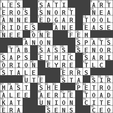 ACROSS 1. French article 4. Suttee (variant) 8. Tate display 11. Greek god of love 13. Derisive sound 15. Teachers' org. 16. Singer Murray 17. _ Allan Poe 18. Utensil 19. Amusement-park features 21. A saturated hydrocarbon 22. Relaxation 23. Born 24. Single 27. Opposite of masc. 29. Soon (poet.) 30. Arguments over trivial matters 34. Keyboard key 36. Backtalk 39. Sir (Sp.) 40. Plant excrements 41. Principle of right and wrong 43. Indian skirt 44. Constellation of myth 46. Jane of fiction 47. Affectionate concern, for short 48. Having lost freshness 49. Blunders 51. Shoshoni 53. R.R. building 54. Title for a knight 57. Vertical spar for supporting sails 60. A female animal or person 63. Stone: prefix 65. Toward shelter 66. Nest on high 69. Frog relative 70. Krazy ___ of comics 71. The state of being joined or united 72. Quote 73. Period 74. Elected reps. 75. Corporate head (abbr.) DOWN 1. Memorize 2. Bert's buddy 3. Something which is sent 4. Compass dir. 5. Also 6. Ancient Roman robe 7. SW Asia republic 8. Small Philippine buffalo 9. Vintage cars 10. Story 12. Observe 14. Unclean, religiously 18. Storms 20. Male child 25. Sense of smell 26. Related on the mother's side 28. Double-curved letter 29. Utter; complete 31. Of or related to the anus 32. Torque (variant) 33. _ Lanka 34. Small pie 35. Capital of Western Samoa 37. Like a shrinking violet 38. Founders of families 40. Distress signal 42. An absolute certainty 45. Fish or hair follower 50. Hit sharply and swiftly 52. Son of Isaac 54. Unemotional 55. Feeling or showing extreme anger 56. Cowboy competition 57. Create 58. Having or resembling wings 59. Stalk of a moss capsule 61. Coop moms 62. 4th largest of the Great Lakes 64. And so on (abbr.) 67. Electrically charged atom 68. Followers of ems