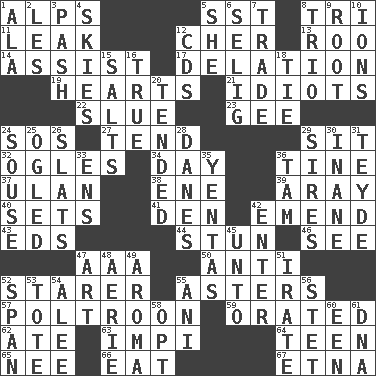 ACROSS 1. High mountains 5. Fast jet (abbr.) 8. Three (prefix) 11. Path through which fluid escapes 12. "Mermaids" star 13. Friend of Pooh 14. Aid 17. Conveyance 19. Centers 21. Foolish or stupid persons 22. Change direction abruptly 23. Turn to the right 24. Mayday 27. Watch over 29. Be seated 32. Stares 34. 24 hours 36. Prong on a fork 37. ____ Bator, Mongolia 38. Compass dir. 39. Like ___ of sunshine 40. Arranges properly for use 41. Lair 42. Make improvements or corrections to 43. Begley and Asner 44. Surprise greatly 46. Perceive with the eye 47. Auto club (abbr.) 50. Against 52. A viewer who gazes fixedly 55. Michaelmas daisies 57. Characterized by complete cowardliness 59. Declaimed 62. Had dinner 63. Body of Kaffir warriors 64. Adolescent 65. Born 66. Consume 67. Inactive volcano in Sicily DOWN 1. In the manner of 2. French article 3. Romantic infatuation 4. Atmospheres 5. A female animal or person 6. Former Milwaukee Brewers owner Bud 7. Swap 8. Musical group of three 9. Carrot, for example 10. Charged atoms 12. Music discs 15. Table seasonings 16. Loyal 18. Make a knot 20. Looked after 24. Lush 25. Stared 26. Narrow boards 28. Natives or inhabitants of Denmark 29. Titles for men of rank and authority 30. Silly 31. Miss Universe 1986, Barbara Palacios _ 33. Followers of ems 35. Gossips 36. Scottish cap 42. Keyboard key 45. To (old English) 47. Nonscientific branch of learning 48. Nest on high 49. Odor 51. Feeling or showing extreme anger 52. Connect, as a bridge 53. Carry 54. Toward shelter 55. Cuckoo 56. Proofreading order 58. Choose 60. Car or cant ending 61. Heredity factor (abbr.)