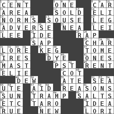 ACROSS 1. Penny 5. Single 8. Automobile 11. Length times width 12. Exchanged or delivered for money 14. Biblical high priest 15. Typical models 17. Lush 18. Part of a journey 19. Contrary to your interests or welfare 21. Teachers' org. 22. Luau accessory 23. Area sheltered from the wind 24. Binary compound 25. Hit sharply and swiftly 27. Plant excrement 28. Burn to charcoal 31. Old wives' tales, e.g. 35. Barrel 37. Heavy book 38. Angers 39. Color 41. Washington bills 42. Vertical spar for supporting sails 43. Pacific Standard Time (abbr.) 45. Monthly bill 46. Writer Wiesel 47. Small bed 49. Morning condensation 51. Had dinner 52. Ocean 55. Shoshoni 57. Help 60. Thinks logically 62. Player for Phoenix 63. _____ steamer (cargo ship) 65. Table seasonings 66. And so on (abbr.) 67. Edible starchy tuberous root 68. The main thing one is thinking about 69. Sorrow 70. ___ Haven, CT 71. Australian parrot (variant) DOWN 1. Lessep's creation 2. Wear away 3. Boldness 4. Docile 5. Bear (Spanish) 6. Part of speech 7. Otherwise 8. Portable communications device 9. Toward shelter 10. Swiss mountan, "Queen of the Mountains" 13. Letter starter 16. Indian titles of respect 17. Oozed 20. Neighbor of Neb. 26. Thespian 29. So be it 30. Respite 31. Citrus frut 32. Taken by mouth 33. Dwelling 34. First name in cosmetics 36. Hustle 40. Fortification 44. Lug 48. Beverages made from leaves 50. Electrical Unit 52. Twentieth part of a lira 53. Keyboard key 54. Slender Brazilian palm 55. One who makes use of a thing 56. Ballerina skirt 58. SW Asia republic 59. Have the gumption 61. Move on water 64. Cut the grass