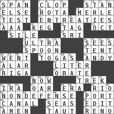ACROSS 1. Connect, as a bridge 5. Hoof sound 9. Comedian Laurel of Laurel & Hardy 13. Otherwise 14. Round or rotation of duties 15. Haggard of country music 16. Trial 17. Pleas 19. American Automobile Association (abbr.) 20. Barrel 21. Label 22. Sep. follower 23. Drop; flow; fall 25. Indian title of respect (Mr.) 26. Extreme 30. Perceives with the eye 34. Soup utensil 35. Portable shelter 36. Gone 39. Ancient Roman robes 42. "60 Minutes" Commentator Rooney 43. Having or resembling wings 44. 61 cubic inches 46. Port city in Latvia 47. Declaim 48. Immediately 51. Long journey 54. Retirement account (abbr.) 57. Boat paddle 58. Period 60. _ de Janeiro 62. Unrelated to defense, as in spending 65. Sweet dark-red dessert wine 66. Lessep's creation 67. Oceans 68. Prepare for publication 69. So be it 70. Drawn tight 71. Western Nevada city DOWN 1. Stalk of a moss capsule 2. Entreaties 3. Slender Brazilian palm 4. Fish or hair follower 5. Algonquian 6. Yearn 7. Baseball player Mel 8. Actors' quests 9. Arrange properly for use 10. Musical group of three 11. Actor Baldwin 12. A home for chicks 15. Wise men 18. Ewer handle 20. Seaweed 24. A period of five years 27. Small child 28. Friend of Pooh 29. White American of non-Hispanic descent 30. A viewer who gazes fixedly 31. Car or cant ending 32. Conclusion 33. Filthy place 36. Armed conflict 37. Biblical high priest 38. Tired old horse 40. Atmosphere 41. R.R. building 45. Singer James 48. Christmas carol 49. Clumsy lout 50. Take or capture by force 52. Wear away 53. Japanese brewing company 54. South American Indian 55. Wander 56. Singer Murray 58. He sold his birthright 59. Repose 61. "Beetle Bailey" pooch 63. Daniel's nick name 64. Teachers' org. 65. For each