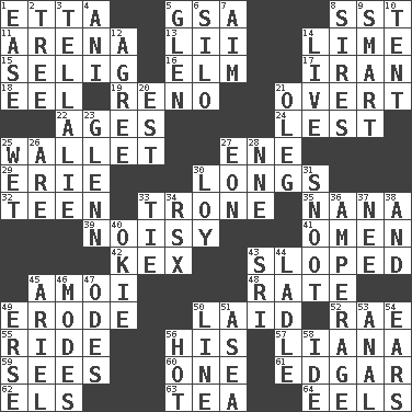 ACROSS 1. Singer James 5. Girls' org. (abbr.) 8. Fast jet (abbr.) 11. Sports stadium 13. Cards in a Roman deck? 14. Citrus frut 15. Former Milwaukee Brewers owner Bud 16. Shade tree 17. SW Asia republic 18. Snakelike fish 19. Former U.S. Attorney General Janet 21. Unconcealed 22. Ripens 24. For fear that 25. Place for singles 27. Compass dir. 29. One of the Great Lakes 30. Yearns 32. Adolescent 33. Marketplace scale 35. Nanny 39. Annoyingly loud 41. Sign of things to come 42. A weed 43. Inclined 45. Mine, in Marseilles 48. Assign a rank or rating to 49. Eat (away) 50. Put down 52. Actress Charlotte 55. Travel on an animal 56. Part of HMS, perhaps 57. Woody, climbing, usually tropical plant 59. Perceives with the eye 60. Single 61. _ Allan Poe 62. Raised railways 63. Afternoon social gathering 64. Snakelike fish DOWN 1. Comfort 2. Relationship diagram 3. Copy Pinocchio 4. Black tropical American cuckoo 5. Small, secluded valley 6. Grain storage tower 7. Direct toward a target or goal 8. Male parents of animals 9. Don Adams' spy role 10. Portable shelter 12. Match 14. Not recorded 20. Eastern Standard Time (abbr.) 21. Cassini of fashion 23. American astronaut and politician John 25. Dripping 26. "We ___ not amused" (Victoria) 27. Period of immesurable duration 28. Compass dir. 30. Myrna of the movies 31. Snob 33. Neckwear 34. Acura sports coupe 36. Electrical Measurement 37. Born 38. Plus 40. Migrant worker of the '30s 43. Indian title of respect (Mr.) 44. Dipping utensil 45. Satellite of Uranus 46. Methods 47. Lyric poems 49. Celtic language 50. Actor's bit 51. At sea 53. Of or related to the anus 54. Hearing organs 56. Being at a high temperature 58. Binary compound