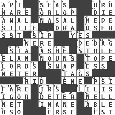 ACROSS 1. Fitting 4. Oceans 8. Globe 11. Female horse 13. Lowest deck of a ship 15. Expire 16. Of or related to the anus 17. Relating to the nose 18. Ancient Persian 19. Vertical member of a panel or frame 21. Mouth or opening 22. One who makes use of a thing 23. Fast jet (abbr.) 24. Small drink 27. Affirmative reply 29. Past tense of be (plural) 30. Debunk (Brit. slang) 34. R.R. building 36. American tennis player Robert 39. Took without asking 40. Flair 41. Parts of speech 43. Drink excessively 44. Domineers 46. Fastener 47. Curvy letter 48. Distance measurement 49. Labels 51. To free from 53. Compass dir. 54. Air pressure measure (abbr.) 57. Conductor's collection 60. Big collection agency 63. Ms. Damita and namesakes 65. Composer Stravinsky 66. Prevent from occurring 69. 1994 drama film starring Jodie Foster 70. Fish or hair follower 71. Empty; void 72. Competent 73. Bear (Spanish) 74. Celtic language 75. Eastern Standard Time (abbr.) DOWN 1. Collect or gather 2. Leg coverings 3. Distinguishing feature 4. Male child 5. Period 6. In addition 7. Fly high 8. Lyric poems 9. Travel on or in a vehicle 10. Fermented drink made from hops 12. Pipe bend 14. Live dramatic performance 18. French bagpipes 20. Compass dir. 25. SW Asia republic 26. Mexican monetary units 28. Begley and Asner 29. Nomad 31. Scornful sounds 32. High mountains 33. Unit of force equal to gravity 34. _ gin 35. Small pie 37. Attila the _ 38. Related on the mother's side 40. Shade tree 42. Connect, as a bridge 45. Indian title of respect (Mr.) 50. Set 52. "You Light Up My Life" star Conn 54. Military trainee 55. Beverly of Met fame 56. Small island 57. Fine (Spanish) 58. Eras 59. Printing process, for short 61. French philosopher Descartes 62. Play the lead 64. _ tizzy (2 wds.) 67. Followers of ems 68. To sift