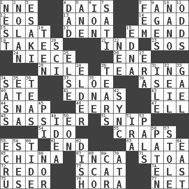 ACROSS 1. Compass dir. 4. Raised platform 8. Papal veil 12. Greek goddess of the dawn 13. Small Philippine buffalo 14. Mild oath 15. Narrow board 17. Undesirable depression on a surface 18. Make improvements or corrections to 19. Proceeds 21. Indiana (abbr.) 23. Mayday 24. Sibling's daughter 26. Compass dir. 28. The longest river in the world 30. Pulling into pieces 34. Arrange properly for use 37. _ gin 39. At sea 40. Had dinner 41. Ferber et al. 43. Whopper 44. Fastener 46. Suggestive of the supernatural 47. Pipe bend 48. More lively and spirited 51. Clip 54. Wedding promise 55. Dice game 58. Eastern Standard Time (abbr.) 61. Conclusion 63. Having winglike extensions 65. Large country 67. South American Indian 71. Portico 72. Do over again 73. Go away! 74. Raised railways 75. One who makes use of a thing 76. Israeli folk dance 77. Fish or hair follower DOWN 1. A home for chicks 2. Pitcher Ryan 3. 1973 Nobel Price Winner (Physics) Leo 4. June honoree 5. A saturated hydrocarbon 6. Electrically charged atom 7. Suttee (variant) 8. Opposite of masc. 9. Eras 10. Billionth: prefix 11. Likelihood 16. Adolescent 18. Pulitzer Prize-winning author Ferber 20. _-fi 22. Born 25. Otherwise 27. Epoch 29. A person who is older than you are 30. Pulls apart 31. Small island 32. Famous astronaut Armstrong 33. Highlander 34. Backtalk 35. Inactive volcano in Sicily 36. Beverages made from leaves 38. Single 42. Synchronize (abbr.) 45. 23rd letter of the Greek alphabet 49. The content of cognition 50. A really long time 52. Lyricist Gershwin 53. Friends 56. Eucharist need 57. Fur scarf 58. Shade of tan 59. "______ My Girl" (Turtles hit) 60. Event that recurs at intervals 62. Food container 64. 90 degrees 66. Not either 68. Non-commissioned officer (abbr.) 69. Automobile 70. "One Day ___ Time"