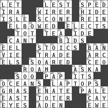 ACROSS 1. Allow 4. For fear that 8. Hurried 12. Lyricist Gershwin 13. One who wires 14. Flintstone garb 15. Small island 17. Biscuitlike quick bread 18. It's straight from the horse's mouth 19. Turned at an angle; bent 21. Opts 23. Small child 24. Afternoon social gathering 26. Binary compound 27. Patter 28. Auction offers 30. Snakelike fish 31. Unemotional ones 34. Bar 37. Compete 38. Buy and sell 39. Curve 40. Raised railways 41. Flew 42. Corporate head (abbr.) 43. Wander 44. "____ silly question..." 46. "Barney Miller" actor Jack 47. Infant food 50. ___ a Wonderful Life 51. Seas 54. Portable computers 57. Pate de foie ____ 58. Related on the mother's side 60. Diluted with white 62. 90 degrees 63. Carrier 64. Island 65. Snake ____ (dice throw) 66. Arabian gulf 67. She-sheep DOWN 1. Cards in a Roman deck? 2. Celtic language 3. Baron Munchausen's specialties 4. It is permitted: Lat. 5. Wear away 6. Elected rep. 7. Woody plant 8. Tears up 9. Part 10. Prepare for publication 11. Habitations of wild animals 13. Compass dir. 16. Inky black, to poets 20. Baseball player Mel 22. Hats (slang) 25. Remain 27. To provide with a ceiling 29. On the rocks 30. Night before a holiday 31. Portico 32. _____ steamer (cargo ship) 33. Boat paddle 34. Keyboard key 35. Type of rug 36. Non-commissioned officer (abbr.) 41. Within a short period 43. Ridicules or criticizes harshly 44. Small island 45. Constrict 46. Gospel singer Marvin 48. Having winglike extensions 49. Eucharist need 51. Double curve, resembling the letter S 52. Supercomputer manufacturer 53. Stalk of a moss capsule 55. For each 56. Cole _ (cabbage dish) 59. Allow head to fall sleepily 61. Sight organ