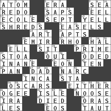 ACROSS 1. Tiny particle 5. Epoch 8. Ocean 11. Make new 12. Plant excrements 14. Snakelike fish 15. Learning spot: Fr. 17. Back-to-school mo. 18. Shout 19. Tears up 21. Artist's stands 23. Nonscientific branch of learning 25. Tenement units (abbr.) 26. Arab leader 27. 17th letter of the Greek alphabet 28. Actor Linden 31. Pipe bend 33. Be seated 35. A-one 37. Portico 38. Fr. "Yes" 40. Wrote a lyric poem 41. Lacking in sense or substance 43. Period of immesurable duration 45. "___ Little Indians" 46. Baking dish 47. Male parent 50. Drug cop 52. South American Indian 53. R.R. building 54. Motion picture awards 56. One or the other 61. Double curve, resembling the letter S 62. Capri or Wight 65. Trap for birds or small mammals 66. Retirement account (abbr.) 67. Passed on 68. Mouths or openings 69. French article 70. Greek goddess of the dawn 71. Tense DOWN 1. Ancient Greek god of war 2. Technical work 3. Scent 4. Undercover agent 5. Double-curved letter 6. Actress Charlotte 7. Become visible 8. Stitch closed the eyes of (a falcon) 9. Snakelike fish 10. 100% 13. Staphylococcus 16. Dutch treat 18. Consenting reply 20. Indian titles of respect 22. Discontinue 24. Musical group of three 26. Flair 28. Flintstone garb 29. So be it 30. Directed 31. Inactive volcano in Sicily 32. Grant temporary use of 34. Third day of the wk. 36. College mil. group 37. Small drink 39. Charged atoms 42. Pulitzer Prize-winning author Ferber 44. Nathan's nickname 48. Sour-tasting 49. Small ungulate mammals of Africa 51. Precipitation 52. Frozen water 54. Legendary monster 55. Oceans 57. A blast of a horn 58. Israeli folk dance 59. Son of Isaac 60. Repose 61. Petroleum 63. Lion 64. Begley and Asner