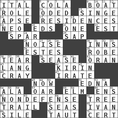ACROSS 1. Slanted text style (abbr.) 5. Root beer relative 9. Water vessel 13. Hero or heavy, e.g. 14. Wrote a lyric poem 15. Scorch 16. Domed church section 17. Dwellings 19. Modern: prefix 20. Begley and Asner 21. Single 22. Eastern Standard Time (abbr.) 23. Practice fight 25. Plant excrement 26. Annoying sound 30. Lodging establishments 34. _____ Park, CO 35. Loose flowing garment 36. Lacerate 39. Gospel singer Marvin 42. Northwest Algerian city 43. Long (Scottish) 44. Japanese brewing company 46. Supercomputer manufacturer 47. Feeling or showing extreme anger 48. Immediately 51. Pulitzer Prize-winning author Ferber 54. In the manner of 57. Rowing implement 58. Shade tree 60. Followers of ems 62. Unrelated to defense, as in spending 65. Family _ (genealogy) 66. Hang back 67. Oceans 68. "Terrible" tsar 69. Drop; flow; fall 70. Drawn tight 71. Foregone conclusion DOWN 1. SW Asia republic 2. Drinks excessively 3. Columnist Joseph or Stewart 4. Area sheltered from the wind 5. Drawstring 6. Lyric poems 7. French article 8. Goodbye (Sp.) 9. Storage container 10. Single time 11. Ripens 12. Trial 15. Ooze 18. Heredity factor (abbr.) 20. Greek god of love 24. Disorder of the immune system 27. It is 28. Perceive with the eye 29. 1973 Nobel Price Winner (Physics) Leo 30. Pressed 31. Not either 32. Basketball assoc. 33. Elected rep. 36. Affectionate concern, for short 37. Ewer handle 38. Santa ___, CA 40. Title for a knight 41. Epoch 45. A whole individual unit 48. Christmas carol 49. Clumsy lout 50. Obtain by seizing forcibly or violently 52. Impudent aggressiveness 53. Approach 54. Pismires 55. Australian parrot (variant) 56. Of or related to the anus 58. He sold his birthright 59. For fear that 61. Transmitted 63. Pass on 64. Teachers' org. 65. Nervous spasm