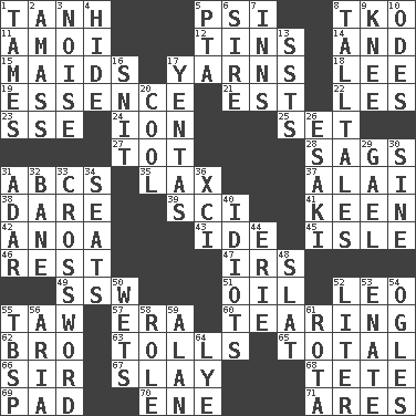 ACROSS 1. Hyperbolic tangent 5. 23rd letter of the Greek alphabet 8. Ring climax 11. Mine, in Marseilles 12. Canisters 14. Also 15. Unmarried girls 17. Tall tales 18. Area sheltered from the wind 19. Core 21. Eastern Standard Time (abbr.) 22. French article 23. Compass dir. 24. Electrically charged atom 25. Arrange properly for use 27. Small child 28. Sinks 31. Lettered men learn these first 35. Not strict 37. Jai ____ 38. Have the gumption 39. _-fi 41. Peachy ____! 42. Small Philippine buffalo 43. Binary compound 45. Small island 46. State of inaction 47. Big collection agency 49. Compass dir. 51. Lubricate 52. Lion 55. The 23rd letter of the Hebrew alphabet 57. Epoch 60. Separating forcefully 62. Sis' sibling 63. For Whom the Bell _____ 65. Add up to 66. Title for a knight 67. Kill 68. Wig 69. Groovy apt. 70. Compass dir. 71. Ancient Greek god of war DOWN 1. Makes less strong or intense 2. Collect or gather 3. Annoying sound 4. Flintstone garb 5. Parent Teacher Assoc. 6. Title for a man of rank and authority 7. Taverns 8. Baron Munchausen's specialties 9. Leg joint 10. Lyric poems 13. Fast planes 16. In a ____ (agitated or irritated) 17. Gossips 20. Calm and collected 26. 1973 Nobel Price Winner (Physics) Leo 29. Highlander 30. Trig term 31. The sixth month of the Jewish calendar 32. Object of repulsion 33. What you're doing now 34. Theater features 36. One more than ninety 40. Foolish or stupid persons 44. One of the Great Lakes 48. Narrow board 50. Soaks 52. 61 cubic inches 53. Maternal 54. Stares 55. Cook's measure (abbr.) 56. Roberta Peters solo 58. Hero or heavy, e.g. 59. Actor Alda or Thicke 61. Round or rotation of duties 64. Sodium hydroxide