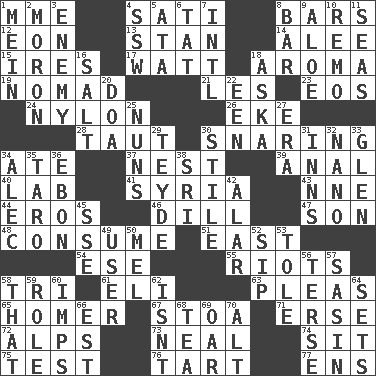 ACROSS 1. Madame (abbr.) 4. Suttee (variant) 8. Taverns 12. A really long time 13. Comedian Laurel of Laurel & Hardy 14. Toward shelter 15. Angers 17. Electrical Unit 18. Scent 19. Wanderer 21. French article 23. Greek goddess of the dawn 24. High-strength synthetic material 26. Make supply last 28. Pulled tight 30. Catching in a trap 34. Had dinner 37. A home for chicks 39. Of or related to the anus 40. Experiment locale 41. Damascus' land 43. Compass dir. 44. Greek god of love 46. Deli pickle 47. Male child 48. Ingest 51. 90 degrees 54. Compass dir. 55. Disturbances 58. Three (prefix) 61. Connecticut Ivy Leaguer 63. Entreaties 65. Homing pigeon 67. Portico 71. Celtic language 72. High mountains 73. Anneal 74. Be seated 75. Trial 76. Small pie 77. Followers of ems DOWN 1. Count _ (2 wds.) 2. Person of subnormal intelligence 3. Foe 4. Compass dir. 5. _ moment's notice (2 wds.) 6. Make lace 7. International (abbr.) 8. Oblong piece of solid material 9. Medicinal plant 10. San ____ (Riviera town) 11. Oceans 16. Table seasoning 18. "____ silly question..." 20. ___ good deed 22. Car or cant ending 25. Religious women 27. Period 29. Miss Universe 1986, Barbara Palacios _ 30. Vertical member of a panel or frame 31. Restaurants 32. Billionth: prefix 33. Small, secluded valley 34. Actor Baldwin 35. Pacific island yam 36. Inky black, to poets 38. Indian title of respect (Mr.) 42. Having or resembling wings 45. Compass dir. 49. One who uses or employs something 50. Cartoonist voice _ Blanc 52. Small drink 53. Lacquered or enameled metalware 56. Laconic 57. Indian antelope 58. Not this but _ 59. Hero or heavy, e.g. 60. Naughty children 62. Is not 64. Arranges properly for use 66. Eastern Standard Time (abbr.) 68. Beverage made from leaves 69. Rowing implement 70. Keyboard modifier key