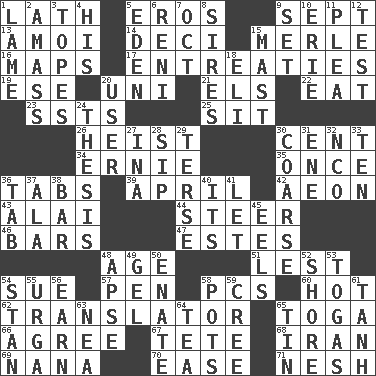 ACROSS 1. Thin strip of wood or metal 5. Greek god of love 9. Back-to-school mo. 13. Mine, in Marseilles 14. Tenth: prefix 15. Haggard of country music 16. Atlas contents 17. Pleas 19. Compass dir. 20. Corn or form start 21. Raised railways 22. Erode 23. Fast planes 25. Be seated 26. Robbery 30. Penny 34. Bert's buddy 35. At one time in the past 36. Bar bills 39. Showery time 42. A really long time 43. Jai _ 44. Bull 46. Long, evenly shaped pieces 47. _____ Park, CO 48. Grow older 51. For fear that 54. Institute legal proceedings 57. Writing instrument 58. Personal Computers (abbr.) 60. Being at a high temperature 62. Interpreter 65. Ancient Roman robe 66. Match 67. False hair 68. SW Asia republic 69. Nanny 70. Comfort 71. Soft DOWN 1. Unable to walk 2. Collect or gather 3. Drinks excessively 4. Part of HMS, perhaps 5. Genesis locale 6. Painter Guido (1575-1642) 7. Sep. follower 8. Male parents of animals 9. Arrange properly for use 10. One of the Great Lakes 11. Entreaty 12. Trial 15. Vertical spar for supporting sails 18. Biblical high priest 20. One who uses or employs something 24. College paper 27. _ tizzy (2 wds.) 28. Small drink 29. Laconic 30. Unrefined 31. Compass dir. 32. Non-commissioned officer (abbr.) 33. Nine, plus one 36. Keyboard key 37. Insect wing 38. Drinking establishment 40. ___ a Wonderful Life 41. Allow 45. Snakelike fish 48. Domed church section 49. Set 50. Related on the mother's side 52. Dinah or Pauly 53. Ancient Roman robes 54. Comedian Laurel of Laurel & Hardy 55. Capital and largest city of Mongolia 56. Merit 58. Cooking vessels 59. Algonquian 61. Hyperbolic tangent 63. Teachers' org. 64. Afternoon social gathering 65. Metal container