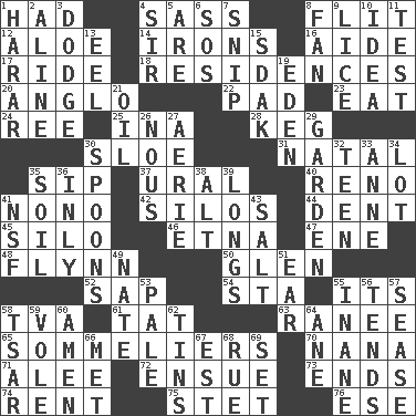 ACROSS 1. Possessed 4. Backtalk 8. Secret move to avoid paying debts 12. _ vera 14. Removes the wrinkles 16. Assistant 17. Travel on or in a vehicle 18. Homes 20. White American of non-Hispanic descent 22. Groovy apt. 23. Erode 24. To riddle 25. _ tizzy (2 wds.) 28. Cask 30. _ gin 31. Brizilian seaport 35. Small drink 37. Mountain range 40. Former U.S. Attorney General Janet 41. Words to Nanette 42. Grain storage towers 44. Undesirable depression on a surface 45. Grain storage tower 46. Inactive volcano in Sicily 47. Compass dir. 48. Film actor Errol 50. Small, secluded valley 52. Plant excrement 54. R.R. building 55. It is 58. Federal power corp. 61. Make lace 63. The wife of a rajah (variant) 65. Wine waiters 70. Nanny 71. Toward shelter 72. Follow as a consequence or result 73. Extremities 74. Monthly bill 75. Proofreading order 76. Compass dir. DOWN 1. Ethiopian city, capital of Harari 2. Place in a line 3. Evade 4. Title for a knight 5. "We ___ not amused" (Victoria) 6. Mayday 7. Sever or remove by pinching or nipping 8. Avid follower 9. Louse (plural) 10. The content of cognition 11. Trial 13. Snakelike fish 15. Neighbor of Neb. 19. Locale of original sin 21. Lubricate 26. Common sense 27. Nest on high 29. Place where plants grow 30. Soup utensils 32. Adolescent 33. Singer Murray 34. Car dealer's back yard 35. The visible part of the earth's surface 36. Inwardly 38. Keyboard modifier key 39. Yearns 41. Overdraft (abbr.) 43. Table seasoning 49. Nathan's nickname 51. Hearing organ 53. Light colored 55. Lacking in sense or substance 56. Watches over 57. Gospel singer Marvin 58. Russian ruler of old 59. Grand slam 60. So be it 62. Canisters 64. One (Scot) 66. Was introduced to 67. Eastern Standard Time (abbr.) 68. Regret 69. Put into a specified state