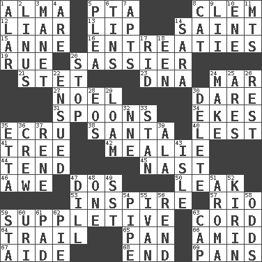 ACROSS 1. _ mater 5. Parent Teacher Association (abbr.) 8. Clement's nick name 12. One who doesn't tell the truth 13. Mouth edge 14. Inhabitant of Heaven 15. Singer Murray 16. Pleas 19. Regret 20. More lively and spirited 21. Proofreading order 23. Heredity factor (abbr.) 24. Spoil 27. Christmas carol 30. Have the gumption 31. Soup utensils 34. Supplements with great effort 35. Shade of tan 38. Before Barbara or Clara 40. For fear that 41. Woody plant 42. Ear of corn 44. Be inclined (to) 45. Political cartoonist Thomas 46. Deep reverence 47. Two (Sp.) 50. Path through which fluid escapes 53. Motivate 57. River (Sp.) 59. Supplying deficiencies 63. Drawstring 64. Drop behind 65. Baking dish 66. Among 67. Assistant 68. Conclude 69. Baking dishes DOWN 1. Having or resembling wings 2. "_ and Lucy" (Charlie Brown theme song) 3. French painter Edouard 4. "We ___ not amused" (Victoria) 5. Entreaty 6. Canisters 7. Flats, for short 8. Feline 9. Cards in a Roman deck? 10. Compass dir. 11. Mountains (abbr.) 14. "Two Mules for Sister ____" 17. To free from 18. Car or cant ending 20. Discontinue 22. Followed as a consequence or result 24. Create 25. Ancient Greek god of war 26. Respite 28. Greek goddess of the dawn 29. Rich soil 30. Keyboard key 32. Compass dir. 33. Comedian Laurel of Laurel & Hardy 35. Singer James 36. Group working together 37. French philosopher Descartes 39. Chicken ___ king 43. Small island 47. Deli pickle 48. Single 49. Fast jet (abbr.) 51. Odor 52. Japanese brewing company 54. Corncob 55. _ the terrible 56. Tear apart 58. Probability 59. R.R. building 60. RI univ. 61. Writing tablet 62. Sliced dessert 63. Head covering