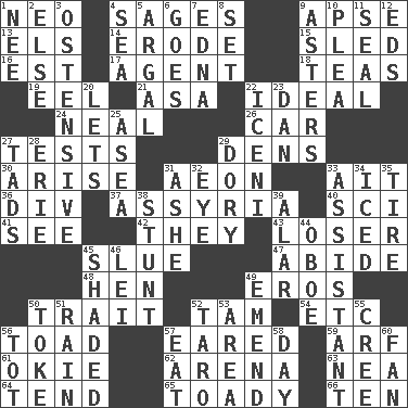 ACROSS 1. Modern: prefix 4. Gurus 9. Domed church section 13. Raised railways 14. Eat (away) 15. Downhill vehicle 16. Eastern Standard Time (abbr.) 17. Rep 18. Afternoon social gatherings 19. Snakelike fish 21. White ___ sheet 22. Standard of perfection 24. Be tempered by heat 26. Automobile 27. Trials 29. Cub Scout units 30. Ascend 31. Period of immesurable duration 33. Small island 36. HTML Container Element 37. Nineveh was its capital 40. _-fi 41. Observe 42. Those things 43. Failure 45. Change direction abruptly 47. Remain 48. Layer 49. Greek god of love 50. Distinguishing feature 52. Scottish cap 54. And so on (abbr.) 56. Frog relative 57. Having ears or earlike features 59. Sandy's bark 61. Migrant worker of the '30s 62. Sports stadium 63. Teachers' org. 64. Watch over 65. Sycophant 66. Nine, plus one DOWN 1. Born 2. Otherwise 3. Clearly or manifestly demonstrative 4. Ocean 5. Therefore, facetiously 6. Leaves 7. Pulitzer Prize-winning author Ferber 8. Put into a specified state 9. Michaelmas daisies 10. Entreaty 11. Lick closed 12. Begley and Asner 20. Allows 22. Ancient Celtic tribe of eastern Britain 23. Daniel's nick name 25. Toward the sea 27. Bits 28. One of the Great Lakes 29. Rowboat 31. American tennis player Robert 32. Sight organ 33. Helper 34. On the rocks 35. Become fatigued 38. Difficult or unusual or dangerous feat 39. Having or resembling wings 44. Mitch Miller's instrument 45. Cast a shadow over 46. Luau accessory 49. Make improvements or corrections to 50. Puff or smoke 51. Precipitation 52. Pacific island yam 53. Type of rug 55. Algonquian 56. Small child 57. Ingest 58. 24 hours 60. Air blower