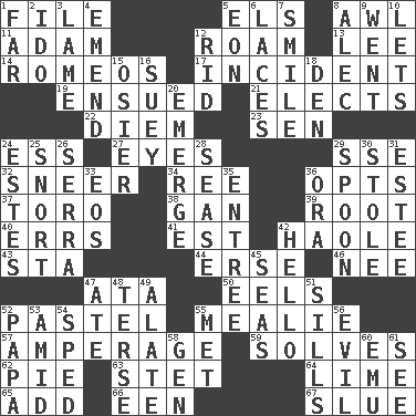 ACROSS 1. Do some clerical work 5. Raised railways 8. Leather borer 11. First man 12. Wander aimlessly 13. Area sheltered from the wind 14. Lover boys 17. Event 19. Followed as a consequence or result 21. Opts 22. South Vietnam president (1954) 23. Elected rep. 24. Curvy letter 27. Snake ____ (dice throw) 29. Compass dir. 32. Scornful expression 34. To riddle 36. Chooses 37. "Corrida" creature 38. Separate the seeds from cotton 39. Carrot, for example 40. Blunders 41. Eastern Standard Time (abbr.) 42. White Person, in Hawaii 43. R.R. building 44. Celtic language 46. Born 47. "One Day ___ Time" 50. Snakelike fish 52. Soft color 55. Ear of corn 57. Electrical Measurement 59. Finds the solution 62. Sliced dessert 63. Proofreading order 64. Citrus frut 65. Increase 66. Car or cant ending 67. Change direction abruptly DOWN 1. Distant 2. Wedding promise 3. Unable to walk 4. Make improvements or corrections to 5. Period of immesurable duration 6. Shoestrings 7. Grin 8. Actor Baldwin 9. Left 10. Allows 12. To free from 15. Flexible twig of a willow tree 16. Chop _ 18. Lair 20. Develop 24. _____ Park, CO 25. Derisive sound 26. Spanish missionary in California 28. Gospel singer Marvin 29. Soup utensil 30. Fur scarf 31. First name in cosmetics 33. Greek goddess of the dawn 35. Main course 36. Mouth or opening 42. Phone greeting 45. Oceans 47. Had dinner 48. Laconic 49. Having winglike extensions 51. Beverly of Met fame 52. Dad 53. Among 54. Moved rapidly 55. Was introduced to 56. Morally bad or wrong 58. Commissioned mil. rank 60. Australian flightless bird 61. Observe