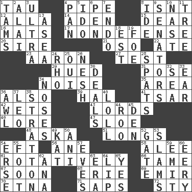 ACROSS 1. The 19th letter of the Greek alphabet 4. Corncob 8. Is not 12. Silent film actress Nazimova 14. Arabian gulf 15. Letter starter 16. Floor coverings 17. Unrelated to defense, as in spending 20. The founder of a family 21. Bear (Spanish) 22. Had dinner 23. Composer Copland 27. Trial 29. Took on color 31. Airs 34. Annoying sound 35. Length times width 36. In addition 39. Actor Linden 41. Russian ruler of old 42. Moistens 43. Nobles 46. Old wives' tales, e.g. 47. _ gin 48. "____ silly question..." 51. Yearns 54. Lizard (obsolete) 56. A saturated hydrocarbon 58. Toward shelter 61. Happening in regular succession 66. Not wild 67. Within a short period 68. One of the Great Lakes 69. Arab leader 70. Inactive volcano in Sicily 71. Plant excrements 72. Filthy place DOWN 1. Scottish caps 2. Jai ____ 3. Extremist 4. Baking dish 5. Wedding promise 6. Fenced enclosure 7. Inside; within (prefix) 8. Binary compound 9. Legislators 10. Political cartoonist Thomas 11. Relationship diagram 13. Toward the sea 18. Eastern Standard Time (abbr.) 19. Enemy 24. 17th letter of the Greek alphabet 25. Fr. "Yes" 26. Soft 28. Arguments over trivial matters 30. Allots cards 32. Ocean 33. Ewer handle 34. Olfactory organs 36. Leather borer 37. Lion 38. Ski resort town in Vermont 40. Hang loosely or laxly 44. Friend of Pooh 45. Lair 49. Krazy ___ of comics 50. Black tropical American cuckoo 52. Yard entry 53. Hits or strikes with great force 54. Celtic language 55. Pick up the tab 57. Nights before holidays 59. Send forth 60. Suggestive of the supernatural 62. Santa ___, CA 63. Period 64. Mouth edge 65. Consenting reply