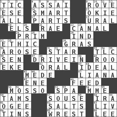 ACROSS 1. Nervous spasm 4. Slender Brazilian palm 9. Be footloose 13. Compass dir. 14. Don Adams' spy role 15. Migrant worker of the '30s 16. Everything 17. Pieces 18. Mountain range 19. Raised railways 21. Actress Charlotte 22. Lessep's creation 24. Demure 26. Indiana (abbr.) 27. Principle of right and wrong 29. Pate de foie ____ 30. Came up 31. Play the lead 33. Affectionate concern, for short 36. Elected rep. 37. Popular '50s hangout 40. Friend of Pooh 41. Supplement with great effort 42. Spoken 43. Perfect 45. Ancient Persian 47. Climbing, woody, usually tropical vines 48. Compass dir. 49. Nourish 50. With motion or animation 52. Health resort 54. Madame (abbr.) 56. Scottish caps 57. Lush 59. Retirement account (abbr.) 61. Double curve, resembling the letter S 62. Table seasonings 63. 54 in ancient Rome 64. Airtight sealed metal containers 65. Obtain by seizing forcibly or violently 66. Area sheltered from the wind DOWN 1. Beverage made from leaves 2. Capri or Wight 3. Portable communications device 4. Viper 5. Excessive but superficial compliments 6. "Two Mules for Sister ____" 7. Johnson of "Laugh-In" 8. It is 9. Periods in a boxing match 10. Gumbo ingredient 11. Small bottle 12. Snakelike fish 20. Indian titles of respect 22. High-altitude cloud 23. Santa ___, CA 25. On the rocks 27. Relaxation 28. Long journey 29. Highlander 31. Title for a man of rank and authority 32. Federal power corp. 33. Excercise machine 34. Grant temporary use of 35. Root beer relative 38. Cowboy competition 39. "Death on the ____" 44. South Vietnam president (1954) 45. Makes clutter 46. Followers of ems 49. Goes without food and/or water 50. Wise men 51. Sign of something about to happen 52. Fly high 53. Whine 55. One of the Great Lakes 56. Small child 57. Compass dir. 58. Eastern Standard Time (abbr.) 60. "___ Maria"
