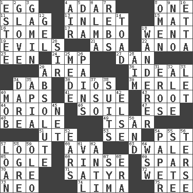 ACROSS 1. Ovum 4. The sixth month of the Jewish calendar 8. Single 11. Volcanic refuse 13. An arm off of a larger body of water 15. Floor protector 16. Heavy book 17. Role for Stallone 18. Left 19. Vices 21. White ___ sheet 22. Small Philippine buffalo 23. Car or cant ending 24. Mischievous child 27. One of the 12 tribes of Israel 29. Length times width 30. Standard of perfection 34. Small moist lump or mass 36. "Vaya con ____" 39. Haggard of country music 40. Atlas contents 41. Take place subsequently 43. Carrot, for example 44. Greek mythologigal hunter 46. Earth 47. Compass dir. 48. Memphis, Tenn. Street 49. Russian ruler of old 51. Shoshoni 53. Elected rep. 54. Pacific Standard Time (abbr.) 57. Spoils 60. Actress Gardner 63. A sleeping potion; an opiate (poet.) 65. Stare 66. Remove soap 69. Practice fight 70. "We ___ not amused" (Victoria) 71. Letch 72. Moistens 73. Modern: prefix 74. Pale green bean 75. To riddle DOWN 1. First name in cosmetics 2. Michael Jackson trademark 3. Homeless child 4. Wind 5. Heredity factor (abbr.) 6. _ mater 7. Confederate soldiers (slang) 8. Presage 9. Billionth: prefix 10. Singer James 12. Set 14. Frog relative 18. Nomad 20. Title for a knight 25. Ancient Persian 26. Aches 28. Direct toward a target or goal 29. Utter; complete 31. Greek god of love 32. _ vera 33. Allow 34. Have the gumption 35. Capital of Western Samoa 37. Bear (Spanish) 38. Costumes for special activities 40. Disorderly crowd 42. Otherwise 45. Fish or hair follower 50. Also 52. Hearing organs 54. Some stationery 55. Chalkboard 56. Laconic 57. Grant temporary use of 58. Legendary monster 59. Margarine 61. Small bottle 62. Opposed to 64. Compass dir. 67. Symbol (abbr.) 68. Period