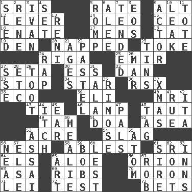 ACROSS 1. Indian titles of respect 5. Pace 9. The first octave above the treble staff 12. Prying instrument 14. Margarine 15. Corporate head (abbr.) 16. Maternal 17. Not women's 18. Make lace 19. Lair 20. Slept 23. Puff or smoke 24. Capital of Latvia 25. Independent ruler or chieftain 27. Bristle 30. Double-curved letter 32. One of the 12 tribes of Israel 33. Cease 34. Play the lead 36. Acura sports coupe 38. Environmental prefix 39. Connecticut Ivy Leaguer 40. Medical imaging device (abbr.) 43. Standoff 46. Desk light 48. Pulled tight 49. Scottish cap 51. ___ good deed 52. Toward the sea 53. Measure of real estate 54. Volcanic refuse 56. Tender 58. Most capable 61. _ Lanka 64. Raised railways 65. Medicinal plant 66. Greek mythologigal hunter 68. White ___ sheet 69. Teases 70. Person of subnormal intelligence 71. Luau accessory 72. Trial 73. Antes DOWN 1. Downhill vehicle 2. French philosopher Descartes 3. "Terrible" tsar 4. Arrange properly for use 5. Frolic 6. Toward shelter 7. Watched over 8. Greek goddess of the dawn 9. Thespian 10. Path through which fluid escapes 11. Carry 13. Painter Guido (1575-1642) 21. Grows older 22. Soft color 23. Airtight sealed metal containers 24. Strike 26. Spoil 27. Compass dir. 28. And so on (abbr.) 29. A blast of a horn 31. Vegetable dish 35. Full of chinks, cracks, or crevices 37. Dec. holiday 41. Sorrow 42. Call ___ day 44. Hankering 45. Hearing organ 47. Friends 48. Label 50. Ear of corn 53. Slender Brazilian palm 55. Smallest unit of an element 56. Anneal 57. Otherwise 59. Moves up and down 60. For fear that 61. Male parent of an animal 62. Carrot, for example 63. Taverns 65. Tate display 67. Director Reiner