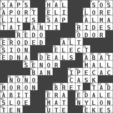 ACROSS 1. Plant excrements 5. Actor Linden 8. Mayday 11. To the left, to Queeg 13. Biblical high priest 14. Old wives' tales, e.g. 15. Ms. Damita and namesakes 16. Plant excrement 17. _ mater 18. Make lace 19. Opposed to 21. Amusement-park features 22. Make new 24. Scent 25. Eaten away 27. Keyboard modifier key 29. The Jewish people; Israel 30. Opt 32. Pulitzer Prize-winning author Ferber 33. Allots cards 35. Blind as ____ 39. Sir (Sp.) 41. Shopping center 42. Bar 43. Medicinal drug used to evoke vomiting 45. Words to Nanette 48. Keg 49. Person of subnormal intelligence 50. Cy Young winner Saberhagen 52. Bit 55. "This won't hurt ____!" 56. Period 57. Peak District village in England 59. A type of plum 60. Floor covering 61. High-strength synthetic material 62. "___ Little Indians" 63. Shoshoni 64. Supplements with great effort DOWN 1. Table seasoning 2. Capital of Western Samoa 3. Characterized by complete cowardliness 4. _ Lanka 5. Behest 6. Mountain range southwest of Kyrgyzstan 7. Mouth edge 8. Twentieth part of a lira 9. Channel Islands abalone 10. Oceans 12. Sadhe (variant) 14. Put down 20. Lower and raise head in agreement 21. College mil. group 23. Ferber et al. 25. Compass dir. 26. To free from 27. 100% 28. French article 30. Ewer handle 31. Makes less strong or intense 33. Heredity factor (abbr.) 34. A really long time 36. Sass 37. Wing 38. Affectionate concern, for short 40. Inky black, to poets 43. Frozen water 44. Eucharist need 45. Having high moral qualities 46. Constellation of myth 47. Short letter 49. Vertical spar for supporting sails 50. Naughty child 51. Pace 53. _ vera 54. Lairs 56. Australian flightless bird 58. Color