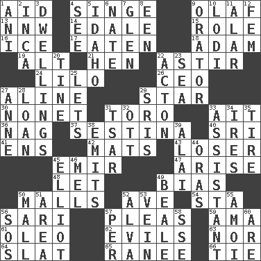 ACROSS 1. Assist 4. Burn superficially 9. Norwegian king 13. Compass dir. 14. Peak District village in England 15. Hero or heavy, e.g. 16. Frozen water 17. Eroded 18. First man 19. Keyboard modifier key 21. Layer 22. Having gotten out of bed 24. _ and Stitch 26. Corporate head (abbr.) 27. Place in a line 29. Play the lead 30. Music written for nine 31. "Corrida" creature 33. Small island 36. Tired old horse 37. French poetic form 40. Indian title of respect (Mr.) 41. Followers of ems 42. Floor protectors 43. Failure 45. Independent ruler or chieftain 47. Originate 48. Allow 49. Prejudice 50. Shopping centers 52. "___ Maria" 54. R.R. building 56. Indian skirt 57. Entreaties 59. Wet nurse (var.) 61. Margarine 62. Vices 63. And not 64. Narrow board 65. The wife of a rajah (variant) 66. Neckwear DOWN 1. Cuckoo 2. South American Indian 3. Homes 4. Observe 5. Potato state 6. Nathan's nickname 7. Small, secluded valley 8. Car or cant ending 9. Speaker 10. Farming town in central California 11. Having or resembling wings 12. Opposite of masc. 20. Prong on a fork 22. 13-14th century defensive garment 23. Ocean 25. Allows 27. Singer Murray 28. Grant temporary use of 29. Indian titles of respect 31. Russian ruler of old 32. Baseball player Mel 33. Aide 34. Angers 35. Hoop that covers a wheel 38. Sends forth 39. Jai ____ 44. Mouths or openings 45. American author Paul (1891-1958) 46. Cartoonist voice _ Blanc 49. Calif. Air Force Base 50. Promenade 51. Length times width 52. Inventor's middle name 53. Distinctive style or manner 55. Mine, in Marseilles 56. Distress signal 57. For each 58. Compass dir. 60. "We ___ not amused" (Victoria)