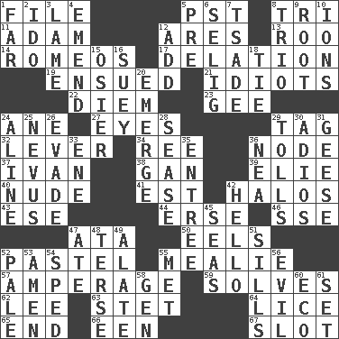 ACROSS 1. Do some clerical work 5. Pacific Standard Time (abbr.) 8. Three (prefix) 11. First of billions? 12. Ancient Greek god of war 13. Friend of Pooh 14. Lover boys 17. Conveyance 19. Followed as a consequence or result 21. Foolish or stupid persons 22. South Vietnam president (1954) 23. Unit of force equal to gravity 24. A saturated hydrocarbon 27. Snake ____ (dice throw) 29. Label 32. Crowbar 34. Portuguese money of account (variant) 36. Connecting point 37. "Terrible" tsar 38. Separate the seeds from cotton 39. Writer Wiesel 40. Unadorned 41. Eastern Standard Time (abbr.) 42. Rings 43. Compass dir. 44. Celtic language 46. Compass dir. 47. _ moment's notice (2 wds.) 50. Snakelike fish 52. Soft color 55. Ear of corn 57. Electrical Measurement 59. Finds the solution 62. Area sheltered from the wind 63. Proofreading order 64. Louse (plural) 65. Conclusion 66. Car or cant ending 67. Position in a hierarchy or organization DOWN 1. At a great distance 2. Wedding promise 3. Unable to walk 4. Make improvements or corrections to 5. Before (prefix) 6. Major League Baseball Commissioner Bud 7. Sadhe (variant) 8. Musical group of three 9. Carrot, for example 10. Charged particles 12. Say or write further 15. Flexible twig of a willow tree 16. Chop _ 18. Make a knot 20. Develop 24. Place in a line 25. Congenital growth or mark on the skin 26. Dodge 28. Gospel singer Marvin 29. For Whom the Bell _____ 30. Goodbye (Sp.) 31. Honkers 33. Compass dir. 35. Main course 36. Teachers' org. 42. Phone greeting 45. Oceans 47. Had dinner 48. Laconic 49. Having winglike extensions 51. Beverly of Met fame 52. Light colored 53. So be it 54. Moved rapidly 55. Was introduced to 56. Morally bad or wrong 58. Commissioned mil. rank 60. Environmental prefix 61. Arrange properly for use