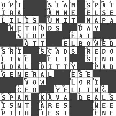 ACROSS 1. Choose 4. Thailand, formerly 8. Argument over a trivial matter 12. Retirement account (abbr.) 13. Queen of England 1702-14 14. Otherwise 15. Ms. Damita and namesakes 18. A single undivided whole 19. California wine valley 20. Modes 22. 24 hours 23. Discontinue 24. Erode 25. Baseball player Mel 26. Shoved, as through a crowd 30. _ Lanka 33. Heaps 36. Do over again 37. Moving, as bait 39. Connecticut Ivy Leaguer 40. Transmit 41. Allodial 42. Simple song 44. Groovy apt. 45. Commissioned military rank 47. Compass dir. 50. Promise 51. Australian parrot (variant) 53. Corporate head (abbr.) 54. Crying or shouting loudly 57. Connect, as a bridge 59. Polynesian shrub of the pepper family 61. Allots cards 63. Is not 64. Ancient Greek god of war 65. Born 66. Heart or essence 67. Trial 68. Compass dir. DOWN 1. Lubricate 2. Demure 3. Lies 4. Saudi Arabian king (1953-1964) 5. Restaurants 6. Black tropical American cuckoo 7. Was introduced to 8. Legislators 9. Live dramatic performance 10. Viper 11. Afternoon social gathering 16. "Tell ____ the Marines!" 17. Opportunity 21. Elects 22. Apply (a substance) by light strokes 24. Raised railways 26. Prepare for publication 27. Shed a tear 28. Pulitzer Prize-winning author Ferber 29. Texas town _ City 30. A hard, heavy blow 31. Travel on or in a vehicle 32. _ the terrible 34. To provide with a ceiling 35. Keyboard modifier key 38. Veterans Day date 42. Fool 43. Shout 46. Friend of Pooh 48. Exchanged or delivered for money 49. 4th largest of the Great Lakes 52. Silly 53. Patter 54. Jacques Cousteau's middle name 55. Compass direction 56. Small, secluded valley 57. Small drink 58. Air pressure measure (abbr.) 59. Krazy ___ of comics 60. "We ___ not amused" (Victoria) 62. Perceive with the eye